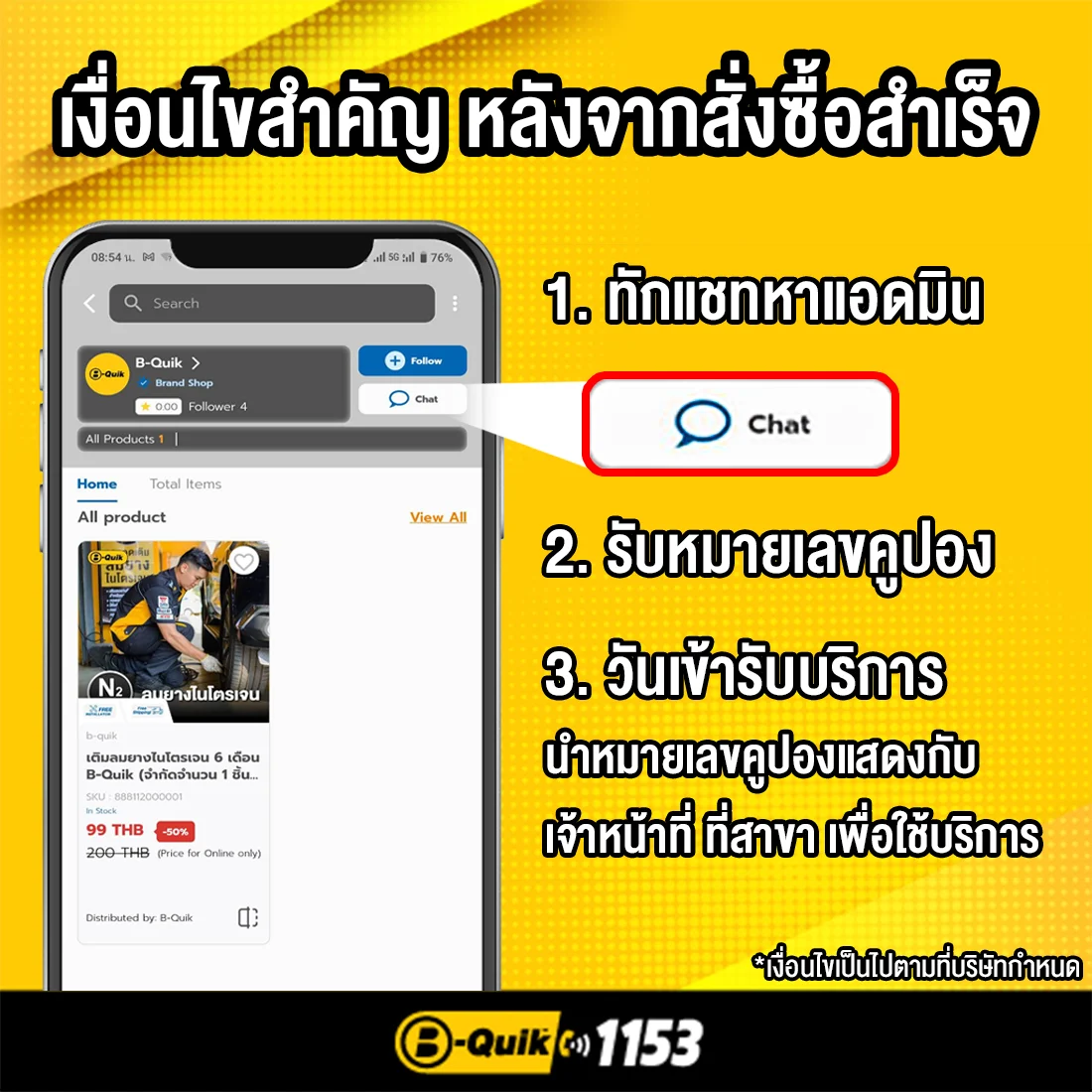 เงื่อนไขที่สำคัญเมื่อสั่งซื้อเสร็จแล้วกรุณาทักแชทเพื่อแจ้งรายละเอียดดังนี้ 1. ศูนย์บริการ บี-ควิก สาขาที่ต้องการเข้ารับบริการ (ลูกค้าไม่สามารถเปลี่ยนแปลงสาขาที่เข้ารับบริการได้ หากแจ้งสาขาที่เข้ารับบริการกับทางแอดมินแล้ว) 2. ชื่อ, เบอร์โทร และวันที่ต้องการเข้ารับบริการ 3. ยี่ห้อรถยนต์ รุ่นรถยนต์ และทะเบียนรถยนต์ 4. คูปองสามารถใช้ได้ครั้งเดียวเท่านั้น คูปองดังกล่าวจะมีอายุการใช้งาน 30 วัน นับหลังจากวันที่สั่งซื้อ มิเช่นนั้นจะถือว่าการสั่งซื้อดังกล่าวเป็น โมฆะ และไม่ทำการคืนเงิน 5. หากต้องการซื้อ E-Coupon หลายรายการ (1 คำสั่งซื้อสามารถใช้ได้กับรถ 1 คันเท่านั้น กรณีไม่ใช้คูปองในวันเดียวกัน หรือสาขาเดียวกัน) กรุณาแยกคำสั่งซื้อ 6. ร้านค้าขอสงวนสิทธิ์ในการเปลี่ยนแปลงเงื่อนไขโดยไม่ต้องแจ้งให้ทราบล่วงหน้า