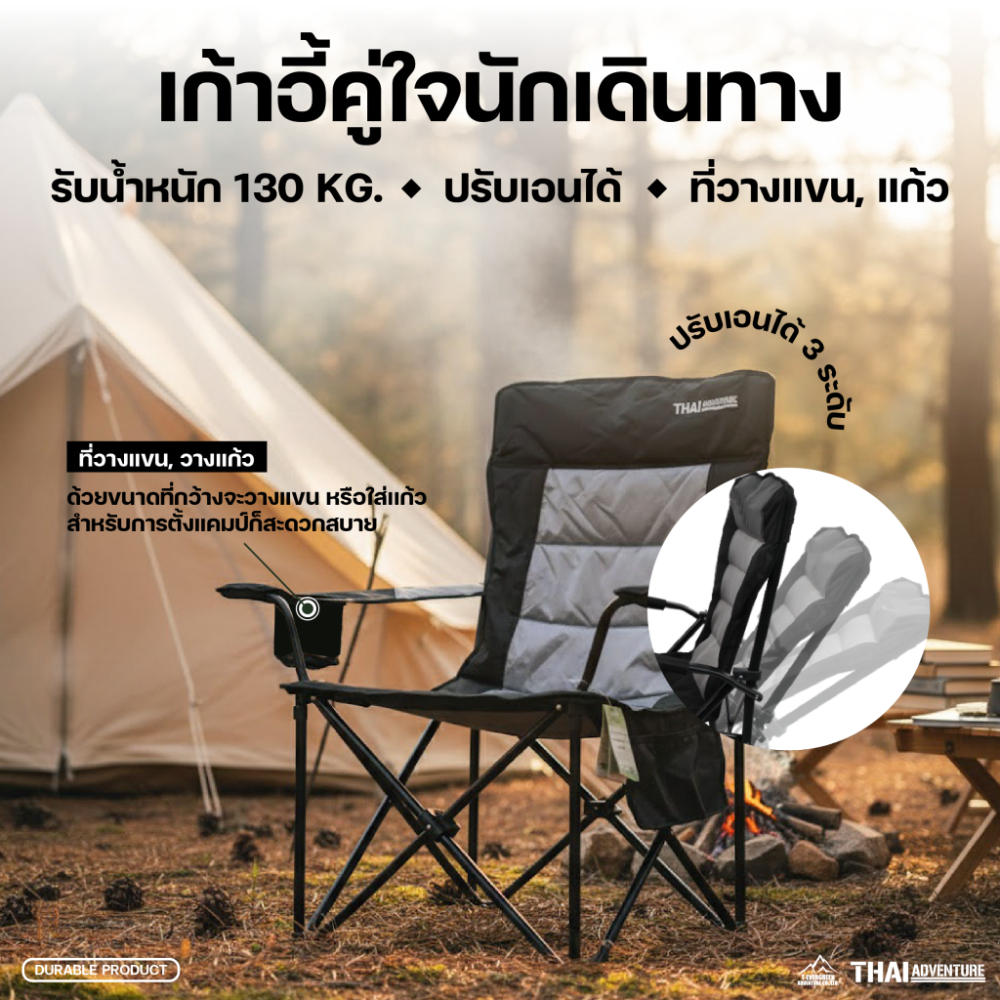 เก้าอี้สนามปรับเอนได้ THAI ADVENTURE รุ่น HAPPY CHAIR สีเทา/ดำเก้าอี้สนาม Happy Chair - เก้าอี้สนามพับได้ บรรจุในกระเป๋าหูหิ้ว พกพาสะดวก - ตัวโครงทำจากอลูมิเนียม แข็งแรง ทนทาน - ผ้า 600 D POLYESTER - ปรับเอนได้ 3 ระดับ - มีพนักพิงบุฟองน้ำคงรูป นั่งสบายทำให้ไม่ปวดหลัง - มีกระเป๋าด้านข้างสำหรับใส่ของเล็กๆน้อยๆ หยิบจับง่าย - มีช่องวางแก้วน้ำ เพิ่มความสะดวกสบาย - รับน้ำหนักได้ 150 กิโลกรัม - ขนาดเก้าอี้: 85 x 70 x 100 ซม. (กว้าง x ยาว x สูง) - ความลึกที่นั่ง: 50 ซม. - ความสูงที่นั่ง: 42 ซม. - วัสดุ: ผ้าโพลีเอสเตอร์ 600D - เคลือบ PVC, ผ้า Rip-Stop พร้อมช่องใส่แก้ว - โครงสร้าง: เหล็กกล้าคาร์บอนสูง - น้ำหนัก 5.34 กิโลกรัม ***สินค้าเป็นสินค้าใหม่ พร้อมส่ง *** **** กรณีลูกค้าต้องการสินค้ามากกว่า 1 ตัว*** แจ้งคุณลูกค้า เนื่องจากสินค้ารายการดังกว่ามีน้ำหนัก ถ้าลูกค้าต้องกว่าสินค้ามากกว่า 1 ชิ้น รบกวนกดสั่งออเดอร์ใหม่นะค่ะ