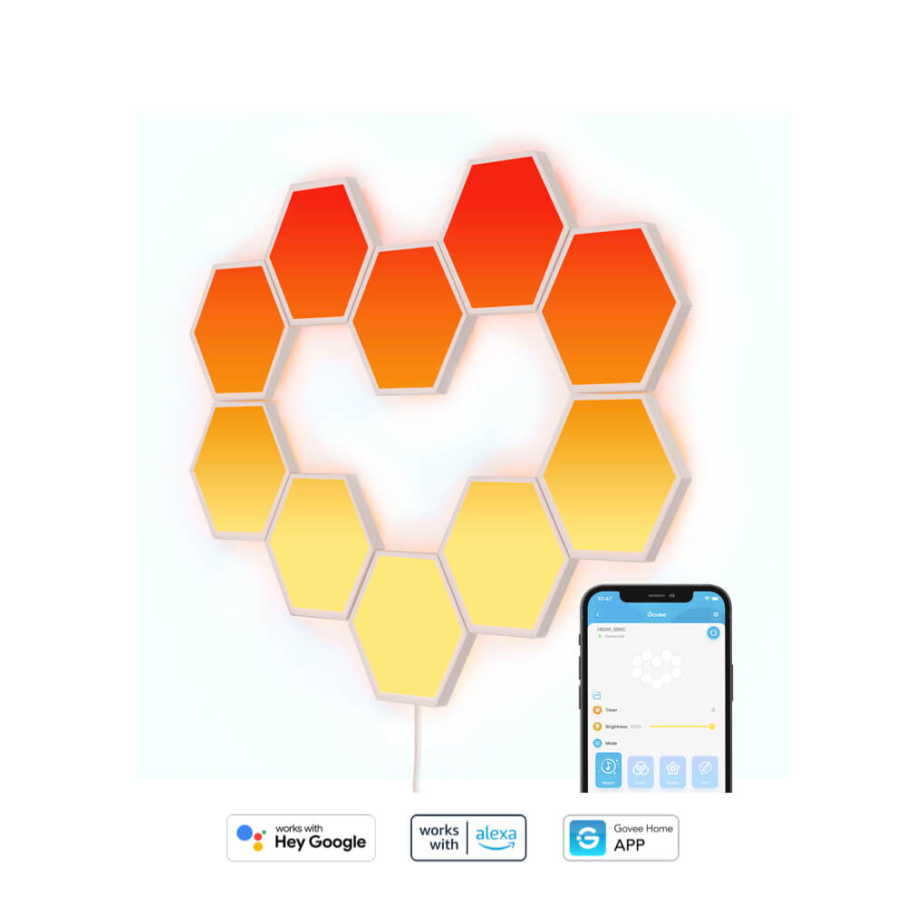 แผ่นไฟติดผนัง GOVEE GLIDE HEXA 36 วัตต์ จำนวน 10 แผงแผ่นไฟติดหนัง Govee Glide Hexa แผ่นไฟติดผนัง Govee Glide Hexa ประกอบด้วยแผง 10 ชิ้นที่สามารถจัดเรียงเป็นรูปทรงต่างๆ ได้ สามารถควบคุมโดยใช้ผู้ช่วยเสียงที่คุณชื่นชอบ เช่น Alexa และ Google Assistant รวมถึงแอป Govee Home คุณยังสามารถปรับแต่งการออกแบบ เอฟเฟกต์ สี และอื่นๆ ได้อีกมากมาย