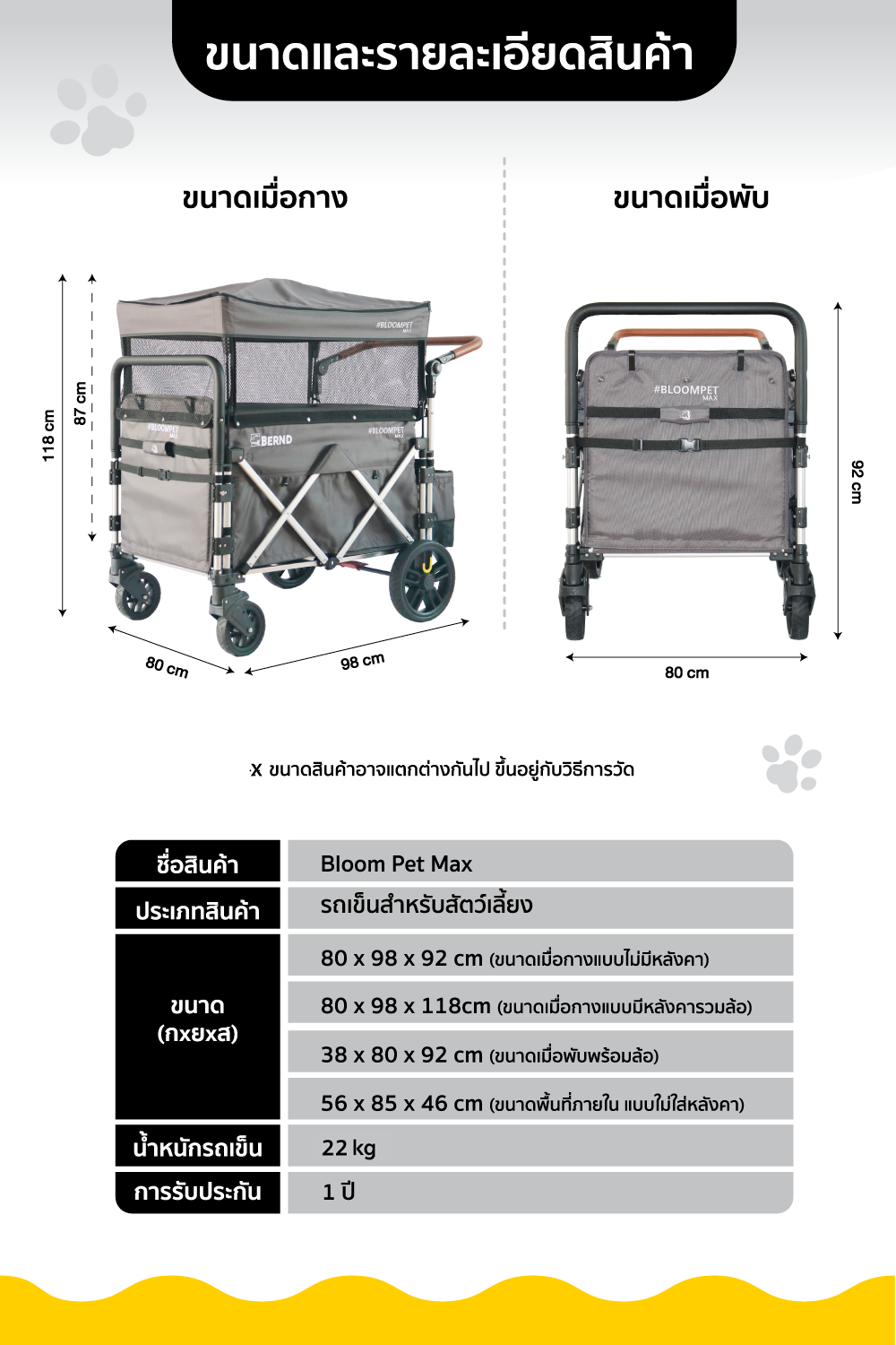 ✅ ขนาดสินค้า : (กxยxส) Bloom Pet Max ➢ ขนาดเมื่อกางและเปิดประตู : 80 x 137 x 118 cm. ➢ ขนาดภายใน : 56 x 85 x 46 cm. ➢ ขนาดเมื่อพับ (พร้อมล้อ) : 38 x 80 x 92 cm. ➢ น้ำหนัก (ไม่รวมหลังคา) : 19 Kg. ➢ น้ำหนัก (รวมหลังคา) : 22 Kg. **ขนาดสินค้าอาจแตกต่างกันไป ขึ้นอยู่กับวิธีการวัด