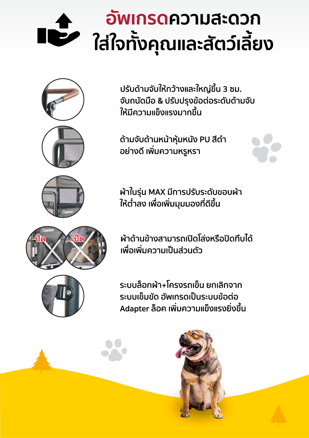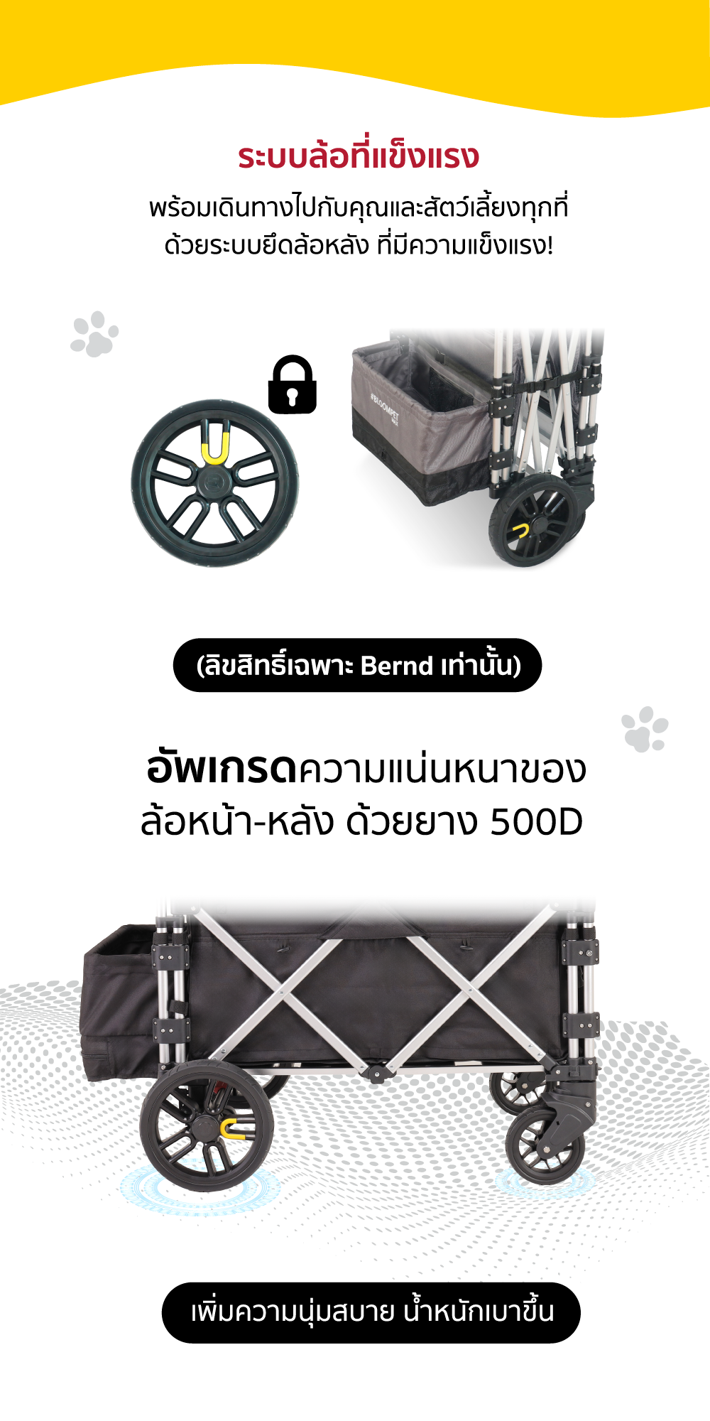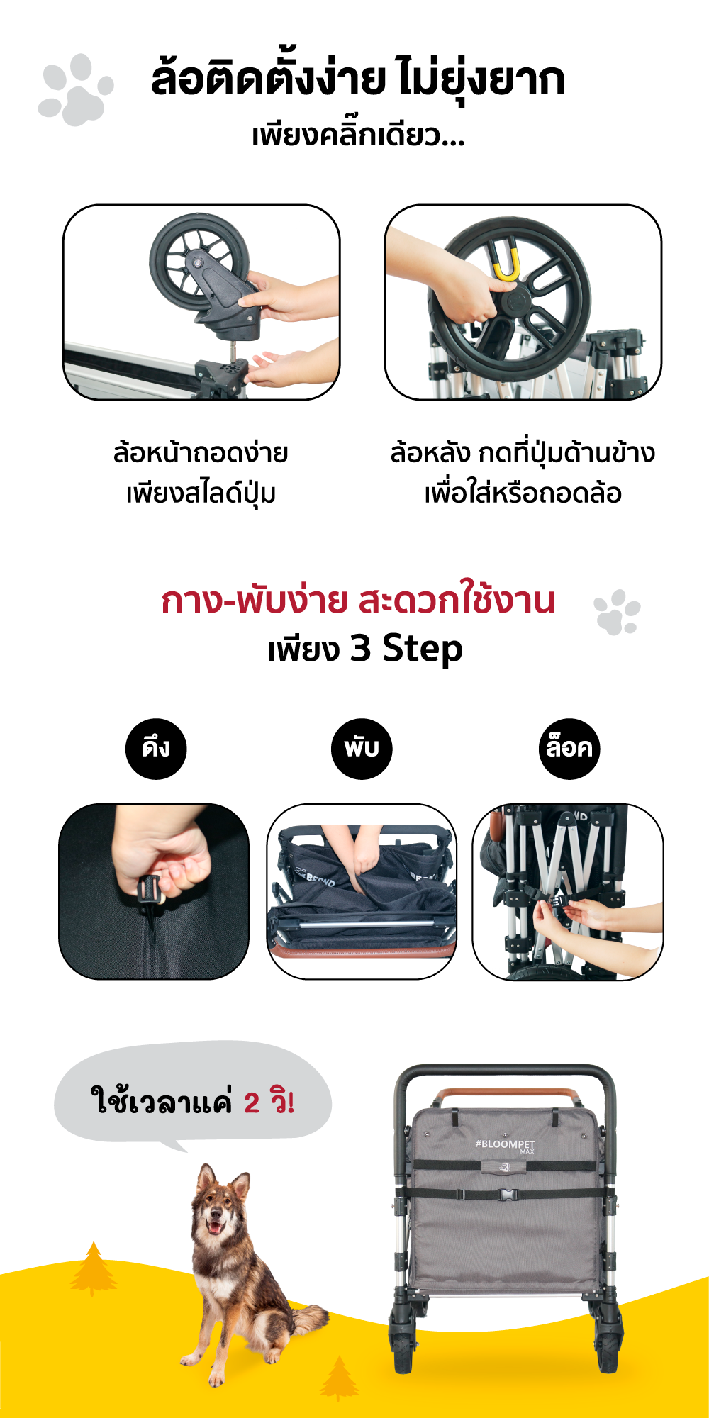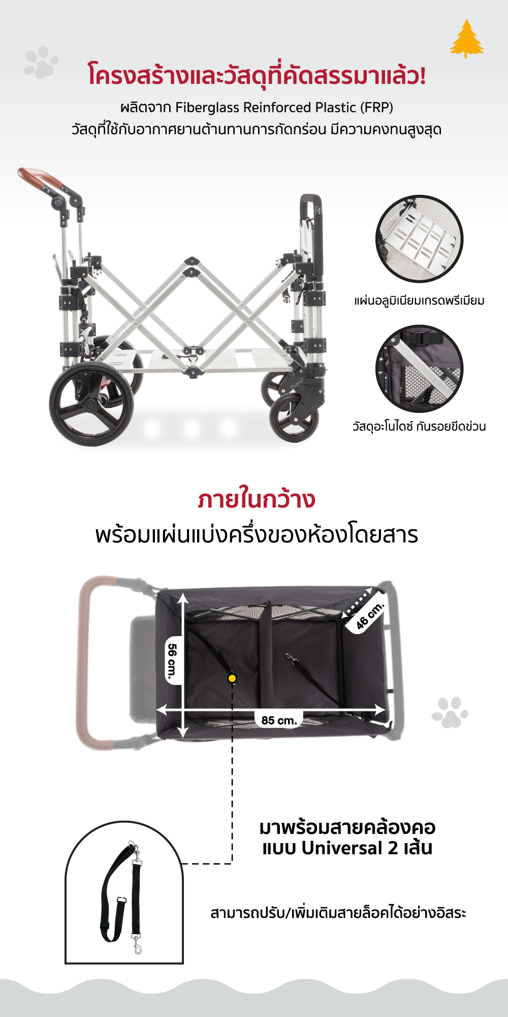 - โครงสร้างรถเข็นผลิตจากพลาสติก FRP และอะลูมิเนียม สามารถใช้งานเป็นทั้งรถเข็นสัตว์เลี้ยงและรถลากได้