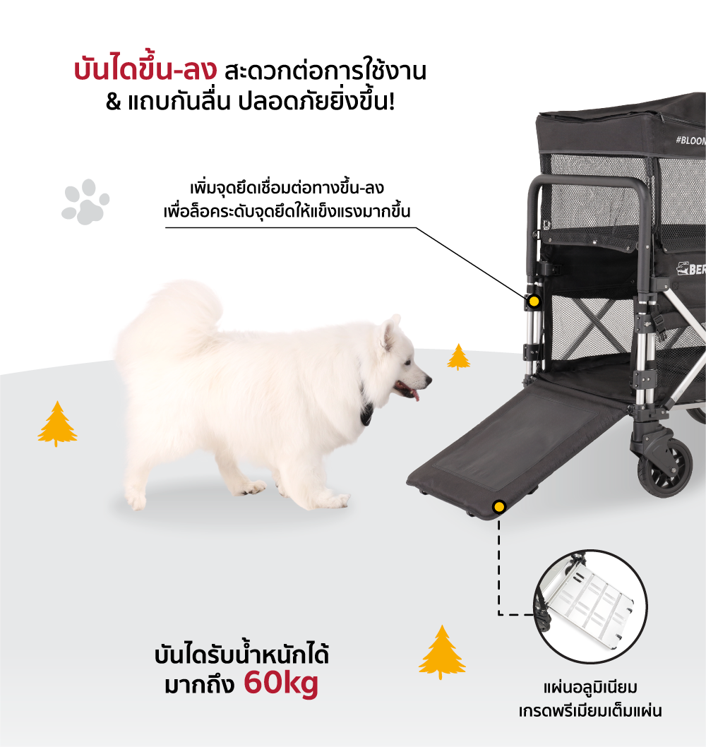 🚩 รายละเอียดสินค้า : ➢ การใช้งานเป็นทั้งรถเข็นสัตว์เลี้ยงและรถลากได้ในหนึ่งเดียว มีความแข็งแรงทนทาน ➢ สามารถใช้ได้ทั้งสัตว์เลี้ยงขนาดใหญ่และสัตว์เลี้ยงขนาดเล็กที่มีจำนวนมาก ➢ มีทางขึ้น-ลง ขนาดใหญ่และแข็งแรง เหมาะสำหรับสัตว์เลี้ยงขนาดใหญ่ ➢ ประตูทางขึ้น - ลง เป็นอะลูมิเนียม มีความแข็งแรง ทนทาน สามารถรองรับน้ำหนักได้สูงสุด 60 kg. พร้อมแผ่นหนังกันลื่น มั่นใจทุกก้าวที่ขึ้นลง ➢ รถเข็นรองรับน้ำหนักบรรทุกได้สูงสุด 100 kg. ➢ ที่นั่งกว้างแถมยังสามารถแบ่งช่องการใช้งานได้ ➢ มีสายล็อกปลอกคอสัตว์เลี้ยง 2 เส้น ➢ ด้ามจับทั้ง 2 ด้านหุ้มด้วยหนัง PU อย่างดี ➢ มีตะกร้าใส่ของ ที่มาพร้อมช่องตาข่ายใส่รองเท้าที่ไม่กักเก็บทรายและสิ่งสกปรก ➢ โครงสร้างเสาหลังคาสามารถซ่อนเก็บได้ ➢ หลังคามองทะลุได้ ➢ หลังคามี 2 ชั้น พร้อมม่านตาข่าย สามารถพับเก็บได้ (มีถุงใส่เมื่อไม่ใช้งาน) ➢ โครงอะลูมิเนียมที่มีความแข็งแรงพิเศษ (high strength aluminium frame) ผลิตจาก Aluminum AL6005 เกรดเดียวกับ อากาศยาน หนา 1.6 mm. ทำให้มีน้ำหนักเบาแต่แข็งแรงมาก ➢ เคลือบผิวกันรอยด้วยระบบ soft Coat Anodizing เทคนิคเดียวกับการผลิตแท็บเล็ตและมือถือชั้นนำ ➢ ชิ้นส่วนข้อต่อ โครง รูปทรงมนไม่มีคม ➢ ชิ้นส่วนผ้า ผลิตจาก Oxford frabric 900D ให้ความสวยงามและทนทาน ➢ มีม่านด้านข้างเปิด - ปิดได้ เพิ่มความเป็นส่วนตัวสำหรับน้อง ๆ ➢ ข้อต่อชิ้นงานผลิตจาก Fiberglass Reinforced Plastic (FRP) ให้ความทนทานกว่าพลาสติกธรรมดา ➢ กางและพับเก็บง่าย ใช้เวลาไม่เกิน 1 นาที ➢ รับประกันโครงสร้าง 1 ปี (ไม่รวมชิ้นส่วนผ้า ตาข่าย หนังและซิป) ➢ มีศูนย์บริการในไทย