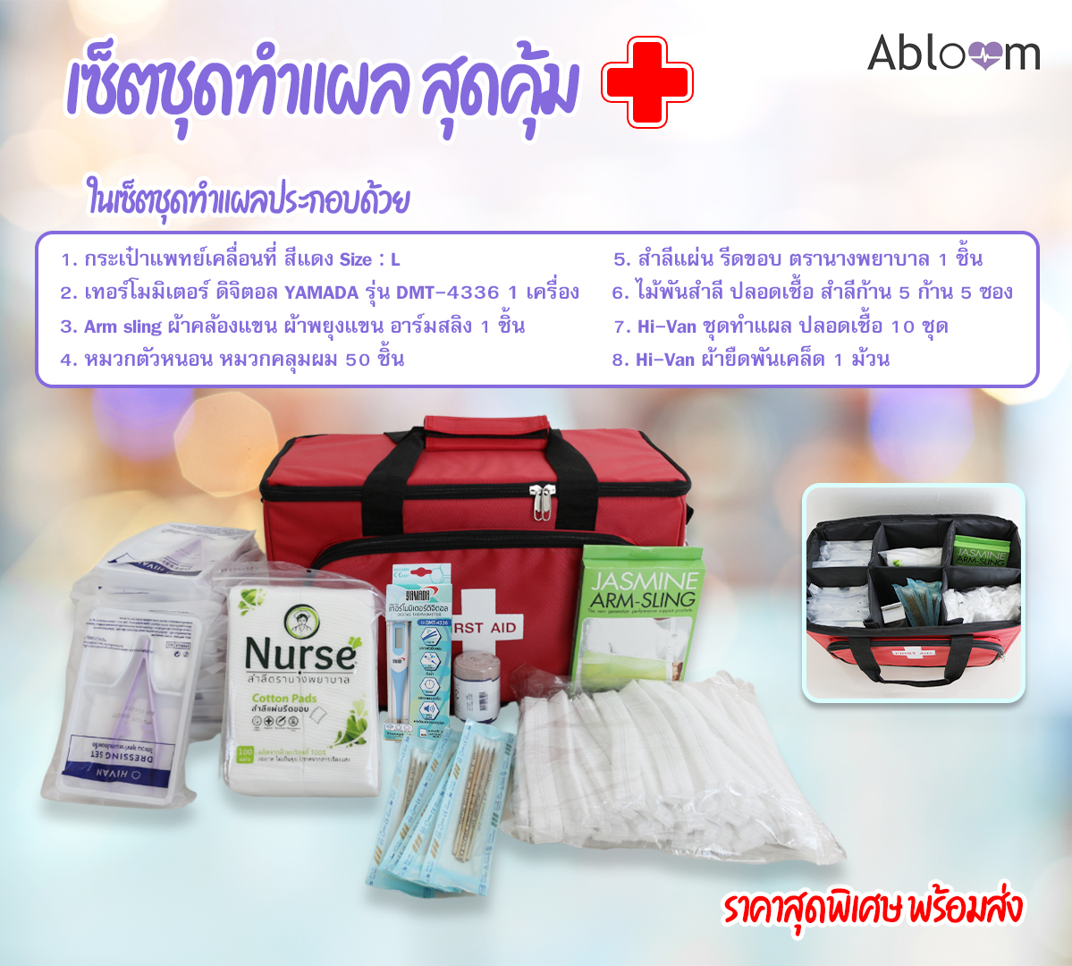 คุณสมบัติกระเป๋า - ขนาด 38 x 20 x 24 ซม. - ด้านหน้ามีช่องซิป 1 ช่อง ข้างในมีที่แบ่งเป็นสำหรับใส่ของแยกเป็นสัดส่วนได้อีก ถึง 6 ช่อง - ทำจากผ้าไนล่อนเนื้อหนา ทนทาน แข็งแรง การตัดเย็บดี - เนื้อผ้ากันน้ำได้ชั่วคราว (น้ำจะไม่ซึมเข้าด้านในทันที หากรีบเช็ดเมื่อกระเป๋าโดนน้ำ) แต่ ไม่ควรนำไปแช่น้ำทิ้งไว้ - ทำความสะอาดง่าย - สามารถถือได้ สะพายได้ สะดวกต่อการใช้งาน - ใช้เก็บยา และอุปกรณ์ปฐมพยาบาลต่างๆ - มีช่องสามารถปรับตามการใช้งาน ทำให้หยิบของได้ง่าย - รับน้ำหนักได้ไม่เกิน 10kg. - น้ำหนักกระเป๋าประมาณ 1.5 กิโลกรัม - ควรเก็บไว้ในที่ร่ม ในเซตประกอบด้วย - กระเป๋าแพทย์ 1 ชิ้น - ผ้าพันเคล็ด 1 ชิ้น - ไม้พันก้านสำลี 5 ซอง - ชุดทำแผล 10 ชุด - Jasmine Arm Sling 1 ชิ้น - ที่วัดไข้ YAMADA รุ่น DMT-4336 1 ชิ้น - หมวกตัวหนอน 1 แพ็ค (50 ชิ้น) - สำลีแผ่น 1 ห่อ