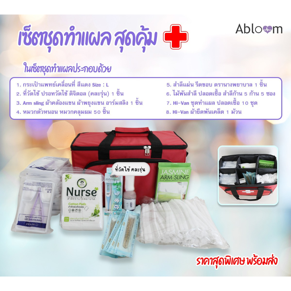 คุณสมบัติกระเป๋า - ขนาด 38 x 20 x 24 ซม. - ด้านหน้ามีช่องซิป 1 ช่อง ข้างในมีที่แบ่งเป็นสำหรับใส่ของแยกเป็นสัดส่วนได้อีก ถึง 6 ช่อง - ทำจากผ้าไนล่อนเนื้อหนา ทนทาน แข็งแรง การตัดเย็บดี - เนื้อผ้ากันน้ำได้ชั่วคราว (น้ำจะไม่ซึมเข้าด้านในทันที หากรีบเช็ดเมื่อกระเป๋าโดนน้ำ) แต่ ไม่ควรนำไปแช่น้ำทิ้งไว้ - ทำความสะอาดง่าย - สามารถถือได้ สะพายได้ สะดวกต่อการใช้งาน - ใช้เก็บยา และอุปกรณ์ปฐมพยาบาลต่างๆ - มีช่องสามารถปรับตามการใช้งาน ทำให้หยิบของได้ง่าย - รับน้ำหนักได้ไม่เกิน 10kg. - น้ำหนักกระเป๋าประมาณ 1.5 กิโลกรัม - ควรเก็บไว้ในที่ร่ม ในเซตประกอบด้วย - กระเป๋าแพทย์ 1 ชิ้น - ผ้าพันเคล็ด 1 ชิ้น - ไม้พันก้านสำลี 5 ซอง - ชุดทำแผล 10 ชุด - Jasmine Arm Sling 1 ชิ้น - ที่วัดไข้ ดิจิตอล (คละรุ่น) 1 ชิ้น - หมวกตัวหนอน 1 แพ็ค (50 ชิ้น) - สำลีแผ่น 1 ห่อ
