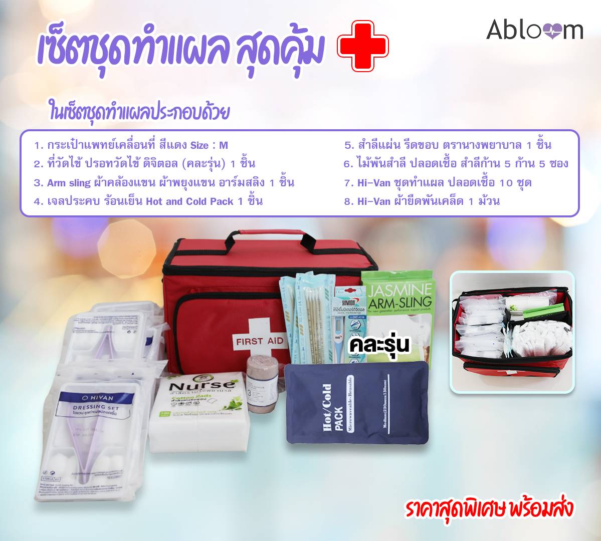 คุณสมบัติกระเป๋า - ขนาด 7.5 x 12 x 7.5 นิ้ว หรือ 19 x 30 x 19 ซม. - ขนาดเมื่อพับ 8.5 x 12.5x 2 นิ้ว หรือ 21x32x5 ซม. - น้ำหนักประมาณ 680 กรัม - ด้านหน้ามีช่องซิป 1 ช่อง ข้างในมีที่แบ่งเป็นสำหรับใส่ของแยกเป็นสัดส่วนได้อีก ถึง 4 ช่อง - ทำจากผ้าไนล่อนเนื้อหนา ทนทาน แข็งแรง การตัดเย็บดี - เนื้อผ้ากันน้ำได้ชั่วคราว (น้ำจะไม่ซึมเข้าด้านในทันที หากรีบเช็ดเมื่อกระเป๋าโดนน้ำ) แต่ ไม่ควรนำไปแช่น้ำทิ้งไว้ - ทำความสะอาดง่าย - สามารถถือได้ สะพายได้ สะดวกต่อการใช้งาน - ใช้เก็บยา และอุปกรณ์ปฐมพยาบาลต่างๆ - มีช่องสามารถปรับตามการใช้งาน ทำให้หยิบของได้ง่าย - รับน้ำหนักได้ไม่เกิน 5kg. - ควรเก็บไว้ในที่ร่ม ในเซตประกอบด้วย - กระเป๋าแพทย์ 1 ชิ้น - ผ้าพันเคล็ด 1 ชิ้น - ไม้พันก้านสำลี 5 ซอง - ชุดทำแผล 10 ชุด - Jasmine Arm Sling 1 ชิ้น - ที่วัดไข้ (คละรุ่น) 1 ชิ้น - เจลประคบ ร้อนเย็น 1 ชิ้น (ราคาปกติ 199 บาท) - สำลีแผ่น 1 ห่อ