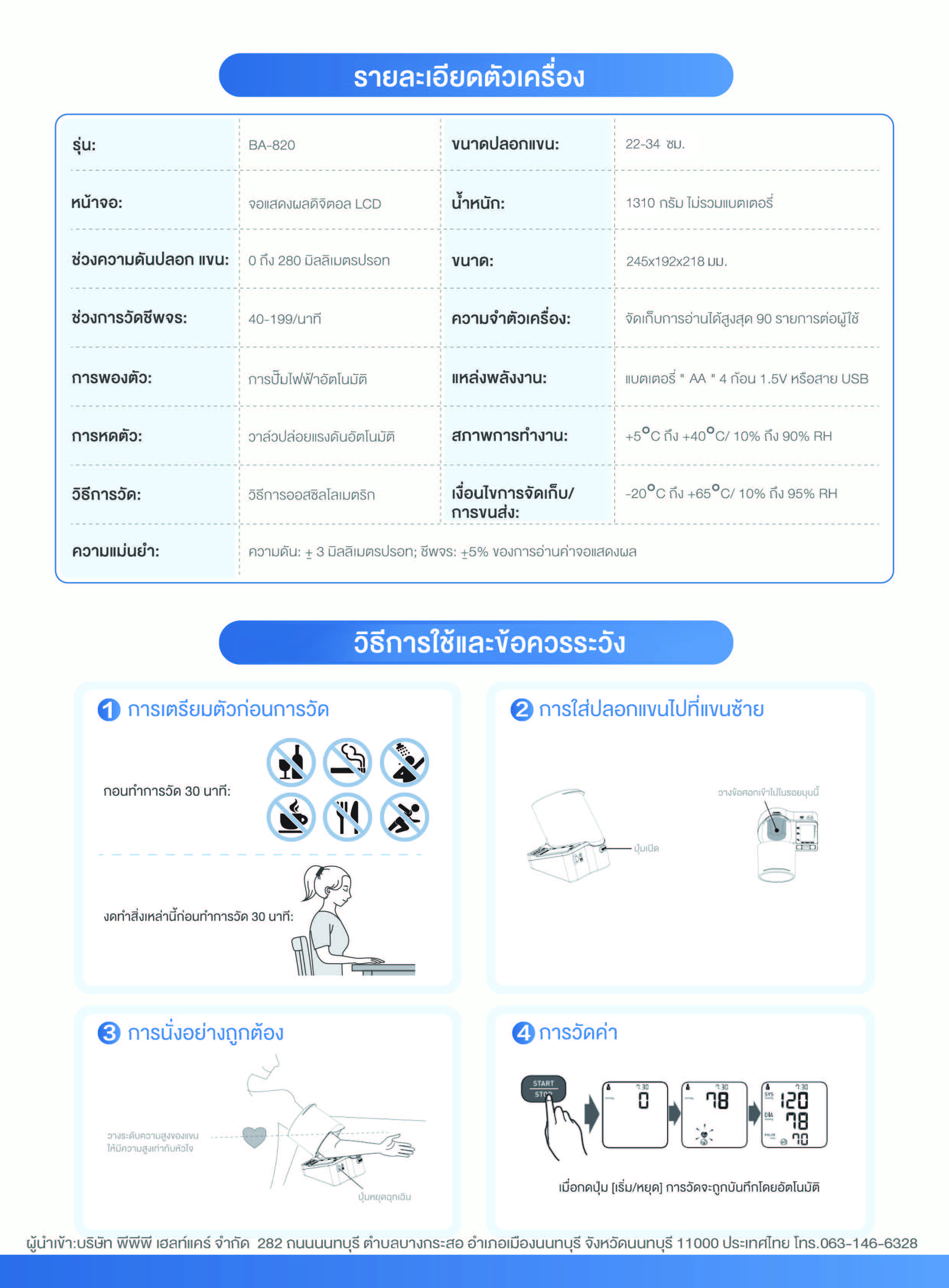 ✔️หน้าจอแสดงผลดิจิตอล LCD ✔️วิธีการวัด : การวัดความดันโลหิตแบบรัดแขน ✔️พองตัวและยุบตัวโดยอัตโนมัติ ใช้งานง่ายสะดวก ✔️วิธีการเพิ่มความดัน : เครื่องปั๊มลมอิเล็กทรอนิกส์ ✔️โหมดคลายการบีบรัด : วาล์วปล่อยลม ✔️ขนาดเครื่อง กว้าง X ยาว X สูง (24.5X19.2X21.8) ซม. ✔️ช่วงการวัด (0 -280) mmHg ชีพจร (40 -199) จังหวะ /นาที ✔️ข้อผิดพลาดในการวัดความดัน: ±3 mmHg/±0.4 kPa ชีพจร: ±5% ✔️เส้นรอบวงที่สอดแขน ประมาณ 22-34 ซม. (8.6-13.4 นิ้ว) ✔️น้ำหนักเครื่อง ประมาณ 1310 กรัม (ไม่รวมแบตเตอรี่) ✔️ฟังก์ชันหน่วยความจำ : 90 × 2 คน และค่าเฉลี่ยของผลการวัดล่าสุดทั้ง 3 ครั้ง ✔️แบตเตอรี่ : แบตเตอรี่อัลคาไลน์ 4 × 1.5V (AA) ✔️สินค้านำเข้าภายใต้แบรนด์ Sinocare รับประกันสินค้า 1 ปี ✔️ปิดเครื่องอัตโนมัติ : 1 นาที ✔️ใช้ภายใต้สภาพแวดล้อม : อุณหภูมิ: +5℃~+40°C ✔️ความชื้น : 10%~90%RH ✔️สภาพแวดล้อมในการเก็บรักษา : อุณหภูมิ: -20℃~+65°C ✔️ความชื้น : 10% ~95%RH ✔️จำนวนครั้งทดสอบ : 50,000 ครั้ง