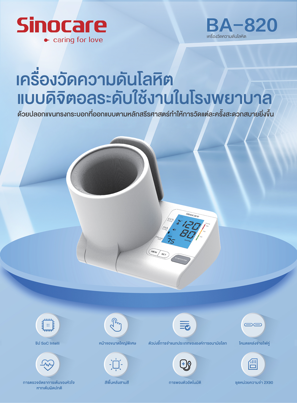ดูแลสุขภาพได้ง่าย ๆ ที่บ้าน ด้วยเครื่องวัดความดันแบบดิจิตอล Sinocare รุ่น BA-820 รุ่นสอดแขน ใช้งานสะดวก ไม่ต้องพันแขนเองให้ยุ่งยาก เพียงแค่สอดแขนเข้าเครื่อง กดปุ่มเดียวก็วัดได้ทันที