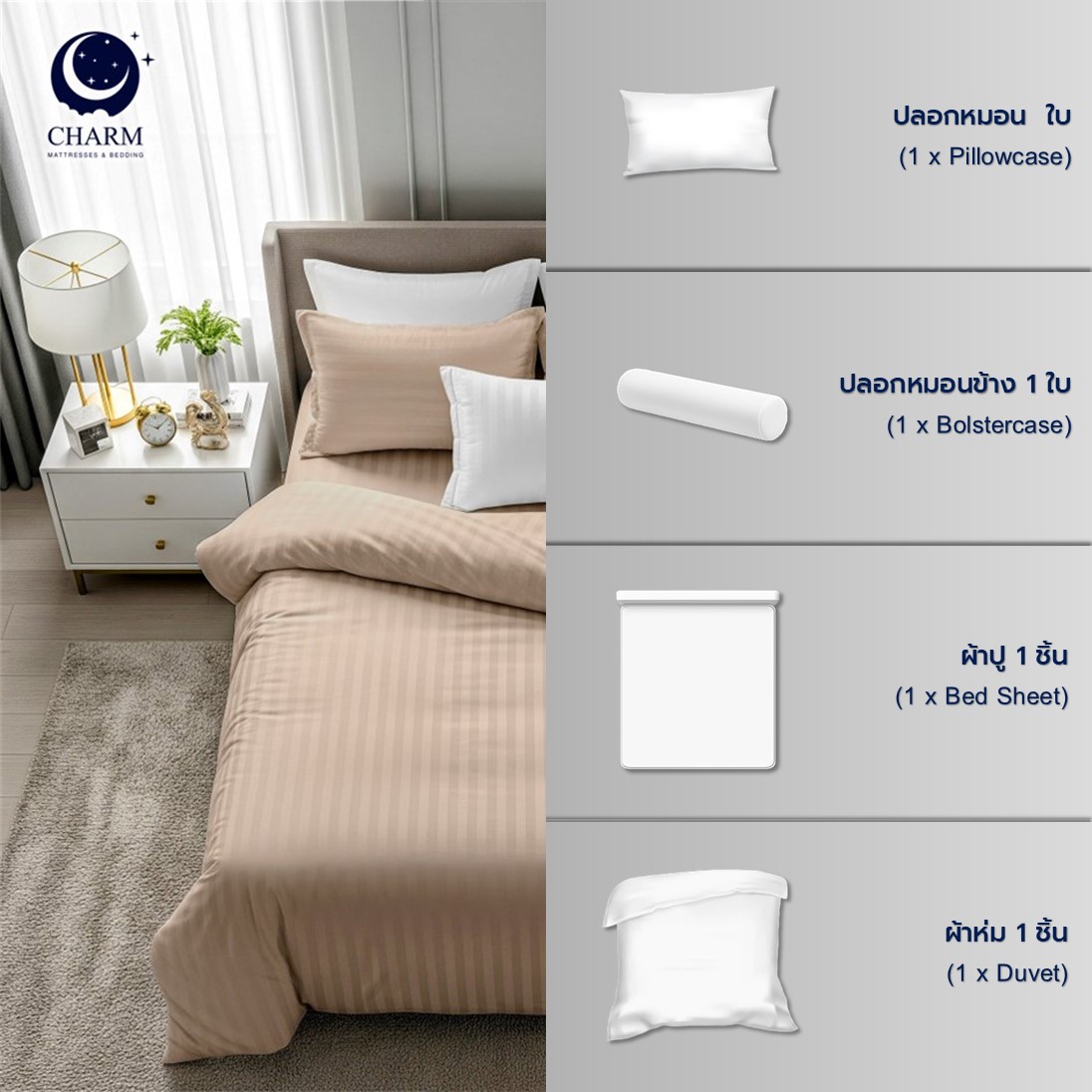 ชุดเครื่องนอน 3.5 ฟุต 4 ชิ้น CHARM ผ้าซาตินลายริ้ว สีเบจ