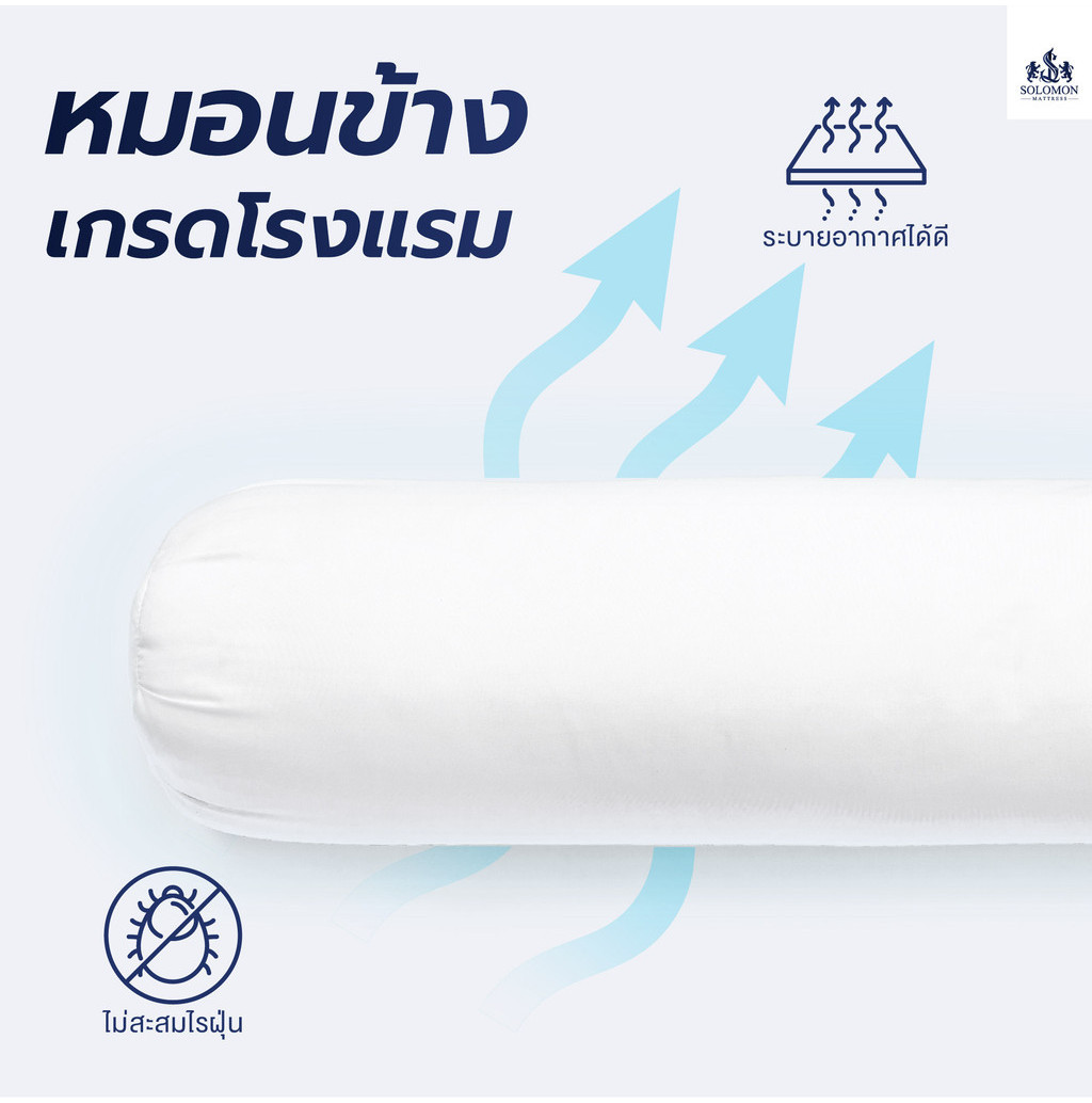 ชุดหมอนหนุน 2 ใบ + หมอนข้าง 1 ใบ SOLOMONคุณสมบัติ หมอนหนุนผลิตจากเนื้อผ้า Cotton 35% และ Polyester 65% หลังซักแล้วเส้นใยไม่รวมเป็นก้อน ขนาด 19 x 29 นิ้ว ป้องกันไรฝุ่นและภูมิแพ้ มีน้ำหนักเบาสบาย ทำให้หลับเต็มตื่นในทุกค่ำคืน พกพาง่าย - หมอนหนุนผลิตจากเนื้อผ้า Cotton 35% และ Polyester 65%