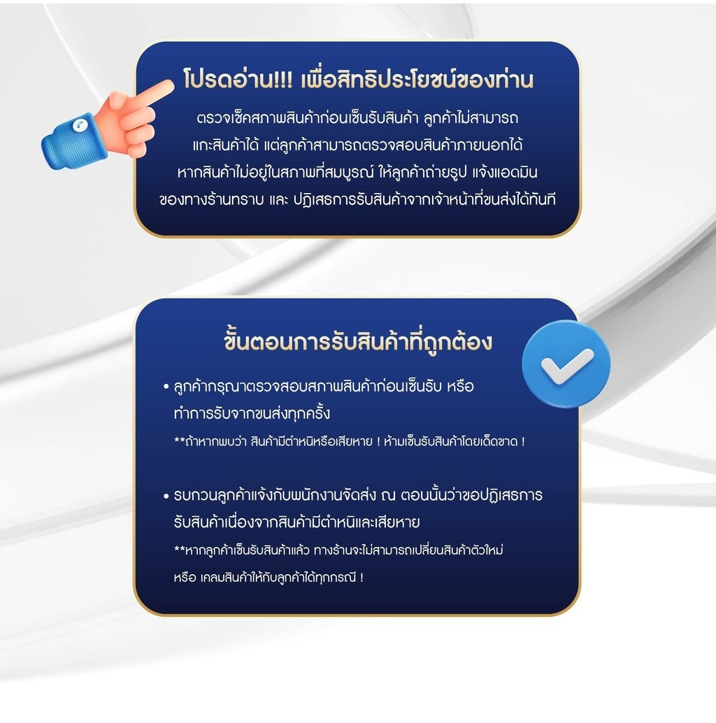 ขั้นตอนการรับสินค้าที่ถูกต้อง - ลูกค้ากรุณาตรวจสอบสภาพสินค้าก่อนเซ็นรับ หรือ ทำการรับจากขนส่งทุกครั้ง ถ้าหากพบว่า สินค้ามีตำหนิ หรือเสียหาย ถ้าหากสินค้ามีตำหนิ หรือ เสียหาย ! ห้ามเซ็นรับสินค้าโดยเด็ดขาด ! - รบกวนลูกค้าแจ้งกับพนักงานจัดส่ง ณ ตอนนั้น ว่าขอปฏิเสธการรับเนื้องจากสินค้ามีตำหนิ และ เสียหาย ! หากลุกค้าเซ็นรับสินค้าแล้ว ทางร้านจะไม่สามารถเปลี่ยนสินค้า หรือ เคลม สินค้าให้กับลุกค้าได้ ทุกกรณี !