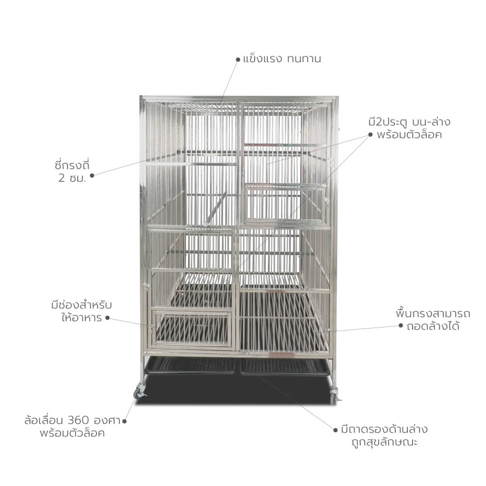 คุณสมบัติ 🔸น้ำหนัก 24 กิโลกรัม 🔸ประกอบง่าย 🔸วัสดุของล้อ ทำจากกัลวาไนซ์ ล้อล็อคได้ และหมุนได้ 360 องศา 🔸พื้นกรงสแตนเลสดึงสไลด์ออกมาล้างทำความสะอาดง่าย 🔸มีช่องให้อาหาร 2 ช่อง บน-ล่าง 🔸มีประตู 2 บาน บน-ล่าง