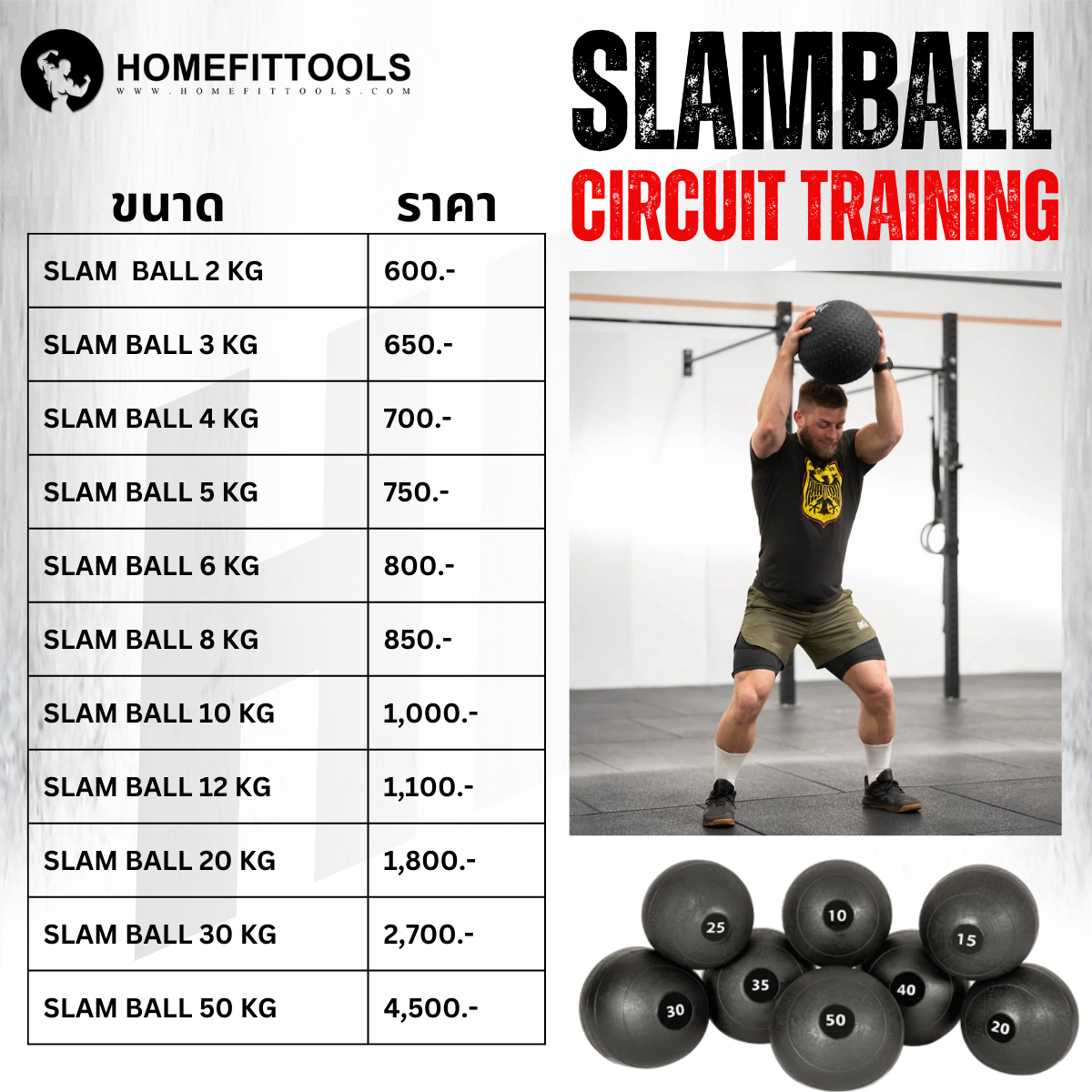 ลูกบอลทุ่มน้ำหนัก HOMEFITTOOLS SLAM BALL 50 KGSlamball เป็นลูกบอลกลมที่ออกแบบมาเพื่อการฝึกฝนแข็งแรงและการออกกำลังกายที่มีน้ำหนักเป็นพิเศษ โดยส่วนใหญ่ทำจากยางหรือวัสดุที่ทนทานเหมาะสำหรับการใช้งานที่หนักๆ โดย Slamball มักจะมีขนาดและน้ำหนักต่างๆ ตามช่วงตั้งแต่ 2 kgกรัมถึง 50 kgกรัมหรือมากกว่าก็ได้ เพื่อให้ผู้ใช้สามารถเลือกใช้ตามความต้องการและระดับความยากในการฝึกได้