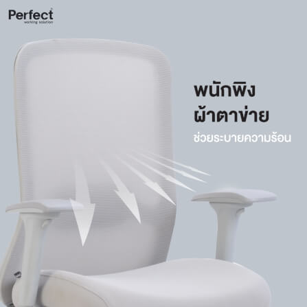 - พนักพิงหุ้มด้วยผ้าตาข่าย ปรับระดับสูง-ต่ำได้ ตามสรีระของคนนั่ง