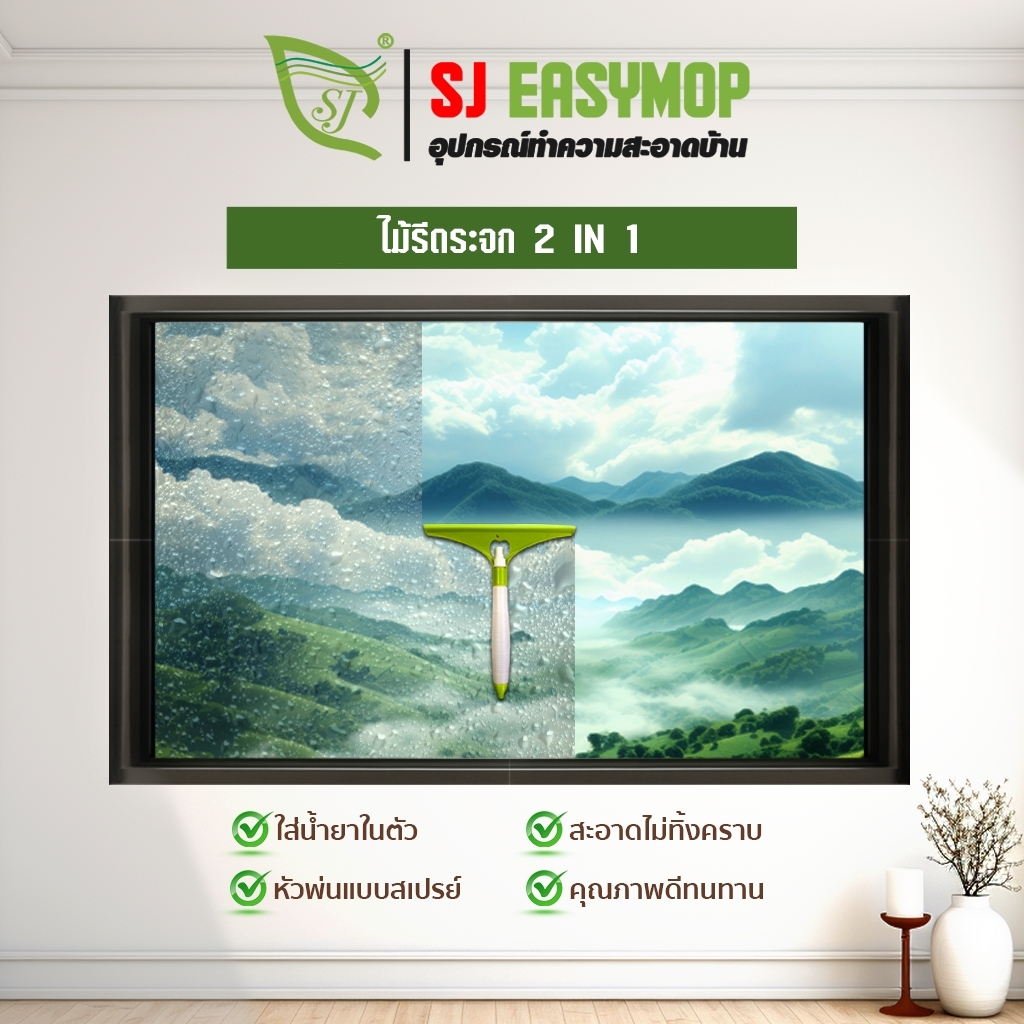 ที่รีดน้ำ SJEASYMOP รุ่น ที่รีดน้ำ B05 สีเขียวไม้เช็คกระจกพร้อมที่ฉีดน้ำถอดได้ คุณสมบัติ ก้านที่ปาดน้ำ ผลิตจากยาง สินค้ายาวรวมด้าม 30 cm. ด้ามจับขวดสเปรย์ถอดได้(150ml) ปาดน้ำได้ดี ไม่ทิ้งคราบ ใช้เช็ดถูทำความสะอาดกระจก และพื้นผิวโดยรอ