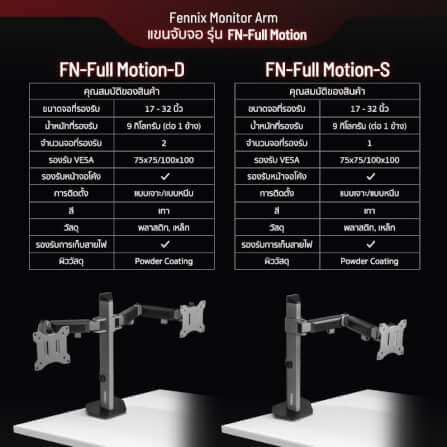 แขนจับจอมอนิเตอร์ Fennix รุ่น FN-Full Motion-D สีเทาFennix Monitor Arm แขนจับจอเหมาะสำหรับจอ 17-32 นิ้ว รุ่น FN-Full Motion รับน้ำหนักได้ 9Kg.- รับประกัน 2 ปี