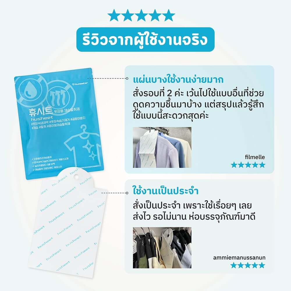 แผ่นลดกลิ่นอับสำหรับตู้เสื้อผ้า HUSHEET กันความชื้น นำเข้าจากเกาหลี (6 แพ็ค แถม 1)HUSHEET แพ็ค 6 แถม 1 แผ่นดูดความชื้น ลดกลิ่นอับตู้เสื้อผ้า (1 แพ็ค บรรจุจำนวน 5 แผ่น) ผลิตภัณฑ์แผ่นดูดกลิ่นรูปแบบใหม่สำหรับตู้เสื้อผ้า ลิ้นชัก ตู้เก็บกระเป๋าหนัง ลดความชื้นตู้ ยับยั้งเชื้อราและลดกลิ่นไม่พึงประสงค์ในรูปแบบแผ่น อย่าปล่อยให้กลิ่นเสื้อผ้าเหม็นอับและเชื้อราในตู้เสื้อผ้าโดยไม่รู้ตัว Husheet นวัตกรรมใหม่คิดค้นโดยนักวิจัยจากสถาบันวิทยาศาสตร์และเทคโนโลยีเกาหลีใต้ (KIST) และทดสอบมาแล้วกว่า 10,000 ครั้ง ปลอดภัยกับการใช้ในบ้าน คุณสมบัติ
