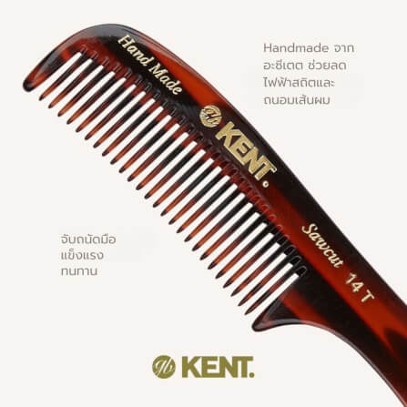 หวีด้าม KENT รุ่น 14T RAKE COMB – หวีซี่ห่างแฮนด์เมด จาก อะซีเตต ขนาด 17 ซม🖤 KENT 14T Handmade Rake Comb 170mmหวีซี่ห่างแฮนด์เมด ขนาดกลาง สำหรับผมหนาและผมหยิก 🇬🇧 หวีระดับตำนานจากอังกฤษ ที่มาพร้อมประสบการณ์กว่า 245 ปีKENT แบรนด์หวีและแปรงที่เก่าแก่ที่สุดในโลก ก่อตั้งขึ้นเมื่อปี 1777 ณ กรุงลอนดอน ประเทศอังกฤษ ด้วยความมุ่งมั่นในการสร้างสรรค์เครื่องมือดูแลเส้นผมที่ดีที่สุด KENT ได้รับพระราชทานตรารับรอง (Royal Warrant) จากราชวงศ์อังกฤษ และยังคงผลิตหวีคุณภาพเยี่ยมด้วยกระบวนการแฮนด์เมดจนถึงทุกวันนี้ 🪞 หวีแฮนด์เมดที่ใส่ใจทุกรายละเอียดKENT 14T คือหวีซี่ห่างขนาดกลาง (170 มม.) ผลิตจากแผ่น Cellulose Acetate คุณภาพสูง ซึ่งเป็นวัสดุจากพืชธรรมชาติ ไม่ขึ้นรูปด้วยการหล่อพลาสติกเหมือนหวีทั่วไป ทุกซี่ฟันถูกตัดด้วยมือ (Hand-sawn) และขัดจนโค้งมนอย่างพิถีพิถัน เพื่อให้ลื่นไหลทุกครั้งที่หวี โดยไม่ทำร้ายเส้นผมหรือหนังศีรษะ ✨ คุณสมบัติเด่น (Highlight)