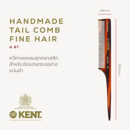 หวีหางแหลม KENT รุ่น8T หวีแฮนด์เมด สำหรับเส้นผมเส้นเล็ก ความยาว 190 มม.🖤 KENT 8T Handmade Tail Comb (190mm)หวีหางแหลมแฮนด์เมด สำหรับผมเส้นเล็ก การแสก และแบ่งช่อผม 🇬🇧 หวีระดับตำนานจากอังกฤษ กว่า 245 ปีแห่งความประณีตKENT คือผู้ผลิตหวีและแปรงผมที่เก่าแก่ที่สุดในโลก ก่อตั้งขึ้นตั้งแต่ปี 1777 ณ กรุงลอนดอน ด้วยชื่อเสียงด้านคุณภาพที่ได้รับความไว้วางใจจากราชวงศ์อังกฤษ และได้รับพระราชทานตรารับรอง Royal Warrant อย่างต่อเนื่องถึง 9 รัชสมัย 🪞 หวีหางแฮนด์เมดเพื่อช่างมืออาชีพ และทุกคนที่ใส่ใจเส้นผมKENT 8T คือหวีหาง (Tail Comb) ขนาด 190 มม. ผลิตจากวัสดุธรรมชาติ Cellulose Acetate ซึ่งมีความยืดหยุ่น แข็งแรง และลดไฟฟ้าสถิต หวีถูก ตัดด้วยมือ (Hand-sawn) จากแผ่น Cellulose Acetate ขนาดใหญ่ ไม่ใช่การหล่อขึ้นรูป ทำให้ทุกฟันหวีได้รับการ ขัดเงาและทำปลายมนอย่างพิถีพิถัน เพื่อให้ลื่นไหลผ่านเส้นผมได้อย่างอ่อนโยน ไม่บาดหนังศีรษะ ✨ จุดเด่นสินค้า (Highlights)