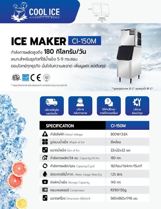 เครื่องทำน้ำแข็ง COOL ICE รุ่น CI-150M กำลังการผลิต 180กก./วันเครื่องทำน้ำแข็ง รุ่น CI-150M