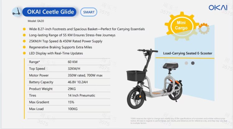 จักรยานไฟฟ้า OKAI รุ่น Ceetle Glide EA20 ซึ่งออกแบบมาโดยคำนึงถึงผู้ใช้ในชีวิตประจำวันเป็นหลัก Ceetle Glide ผสมผสานทั้งความสะดวกสบายและการใช้งานได้จริง โดยยังคงรักษาความสบายของเบาะนั่งอันเป็นเอกลักษณ์ไว้เช่นเดิม พร้อมเพิ่ม แท่งเหล็กด้านข้างดีไซน์เรียบหรู ที่ช่วยเพิ่มพื้นที่จัดเก็บของ ทำให้เหมาะอย่างยิ่งสำหรับการขับขี่ทำธุระหรือใช้งานในเมือง ผู้ขี่ยังสามารถติดตั้ง ตะกร้าหน้ารถ เพิ่มเติมได้เพื่อความอเนกประสงค์ยิ่งขึ้น ด้วยระยะทางวิ่งสูงสุด ประมาณ 50 กิโลเมตร และความเร็วสูงสุด ประมาณ 32 กิโลเมตรต่อชั่วโมง Ceetle Glide จึงเป็นการผสมผสานระหว่าง ความใช้งานได้จริงกับความน่าเชื่อถือ ที่ตอบโจทย์ชีวิตสมัยใหม่อย่างลงตัว