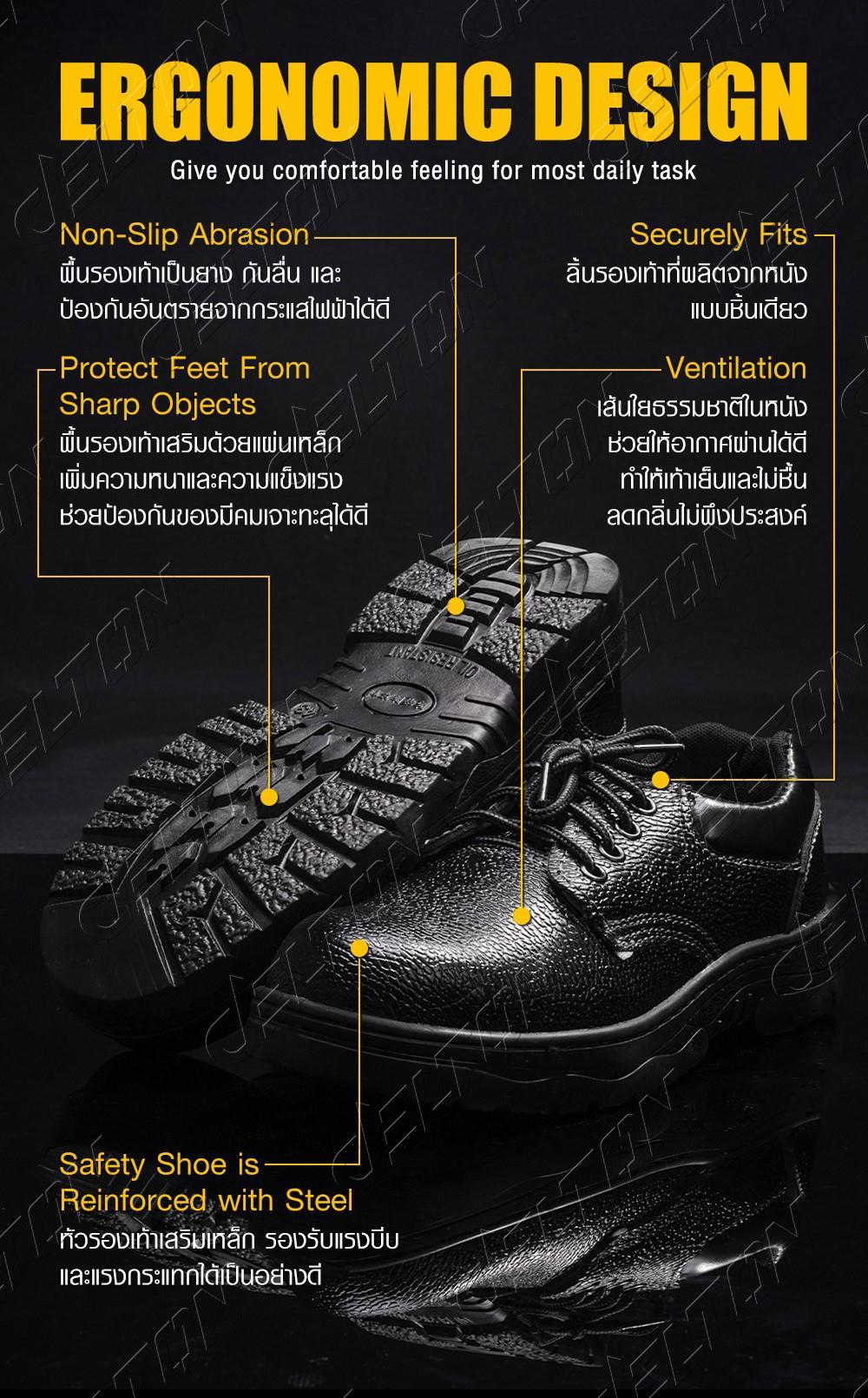 - หัวรองเท้าเสริมเหล็กให้ความแข็งแรงในการป้องกันการเจาะทะลุจากของมีคม ป้องกันอุบัติเหตุจากของตกหรือแรงกระแทก ได้เป็นอย่างดี