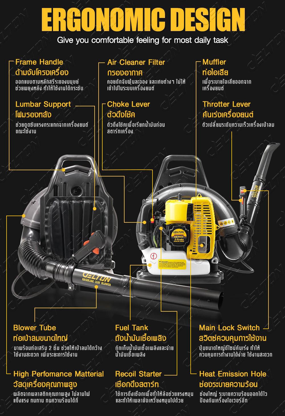 เครื่องเป่าใบไม้ DELTON รุ่น GB-950T สะพายหลัง 6HP 2.9KW— รายละเอียดสินค้า —