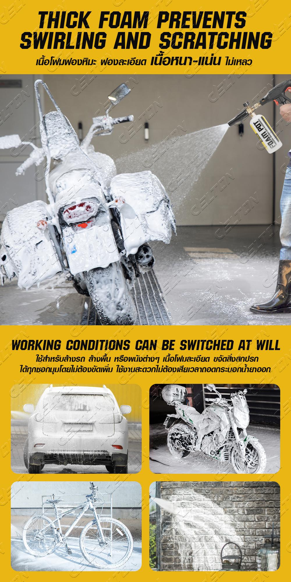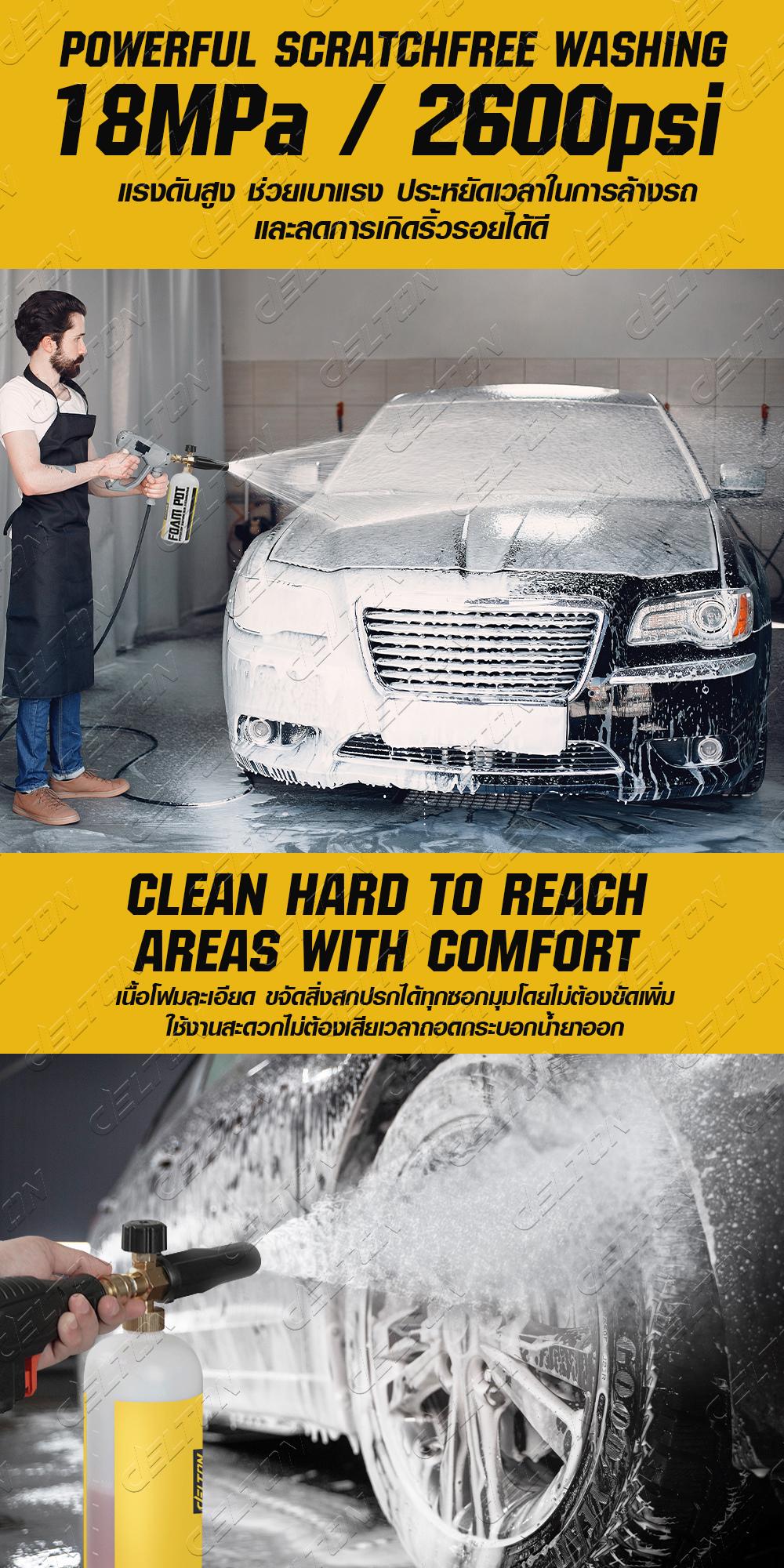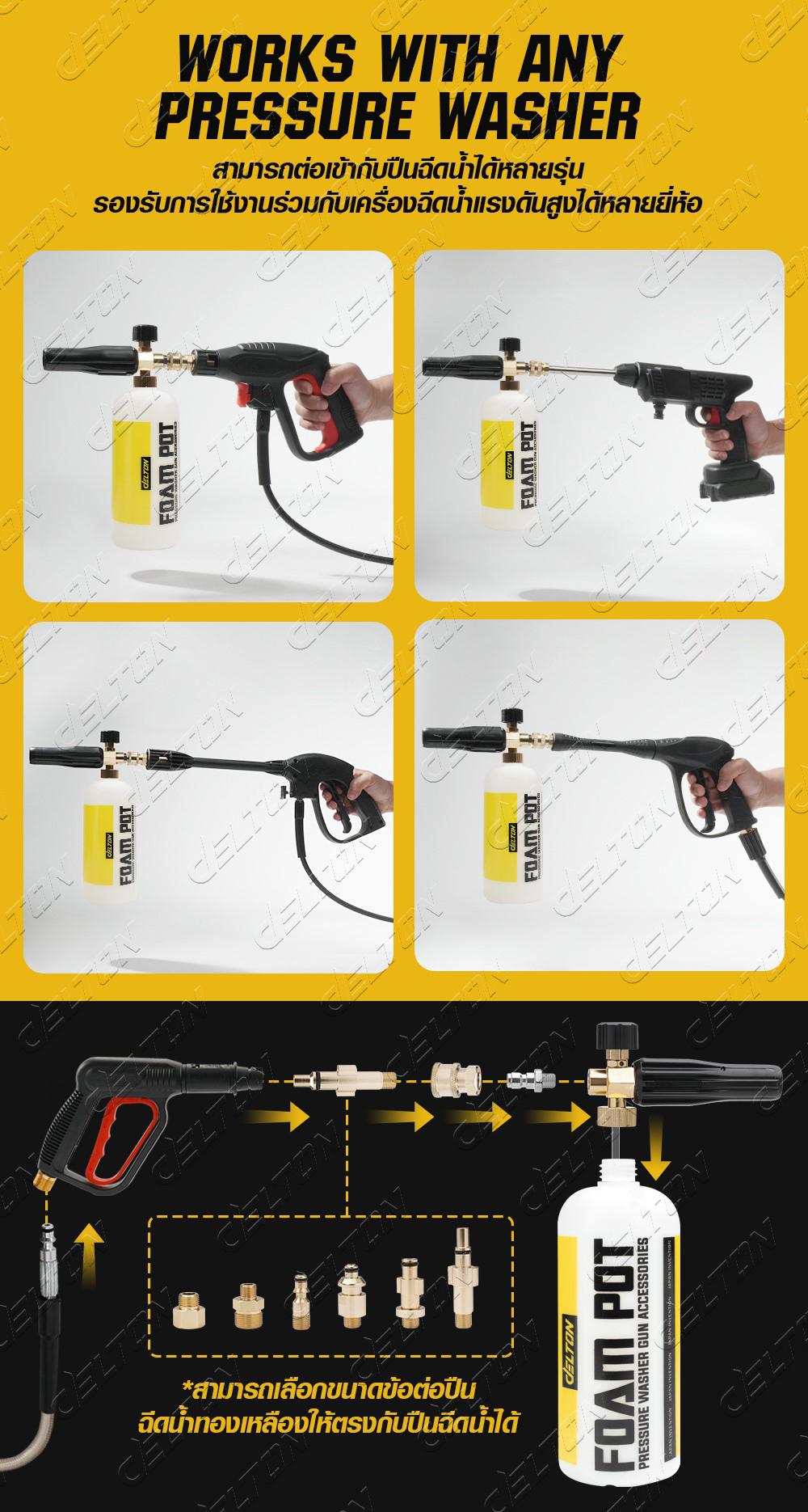 - สามารถต่อเข้ากับปืนฉีดน้ำได้หลายรุ่น รองรับการใช้งานร่วมกับเครื่องฉีดน้ำแรงดันสูงได้หลายยี่ห้อ