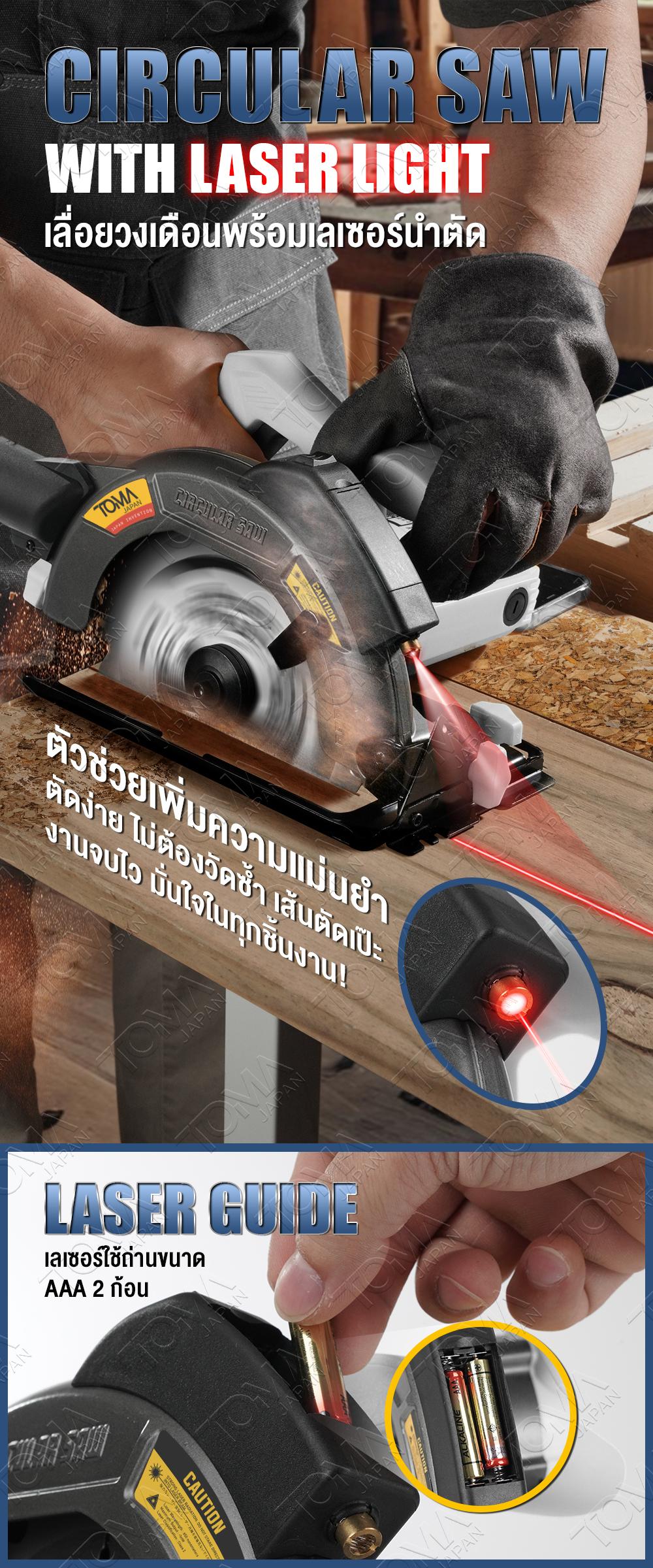- มาพร้อมเลเซอร์นำตัดอย่างดี ช่วยเพิ่มความแม่นยำในการตัด (เลเซอร์ใช้ถ่านขนาด AAA จำนวน 2 ก้อน) มีสวิตซ์ปิด-เปิดแยกอิสระจากตัวเครื่อง