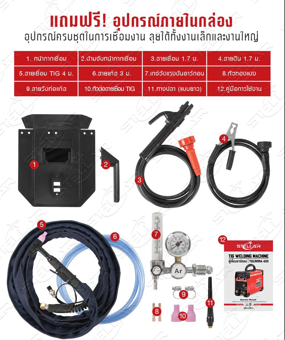 - มาพร้อมอุปกรณ์ครบชุด สายเชื่อมอาร์กอน (เชื่อม TIG) ยาว 4 เมตร, สายเชื่อม ยาว 1.7 เมตร, สายดิน ยาว 1.7 เมตร, สายแก๊ส ยาว 3 เมตร, หัวปรับแรงดันแก๊ส (เกจ์วัดแรงดันอาร์กอน), หน้ากากเชื่อม, สายรัดท่อแก๊ส พร้อมใช้งานได้ทันที