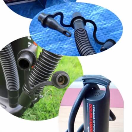 เพียเสียบหัวที่สูบเข้ากับวัสดุเป่าลม ทำการตั้งกระบอกขึ้น แล้วใช้เท้าทั้งสองข้างเหยียบ