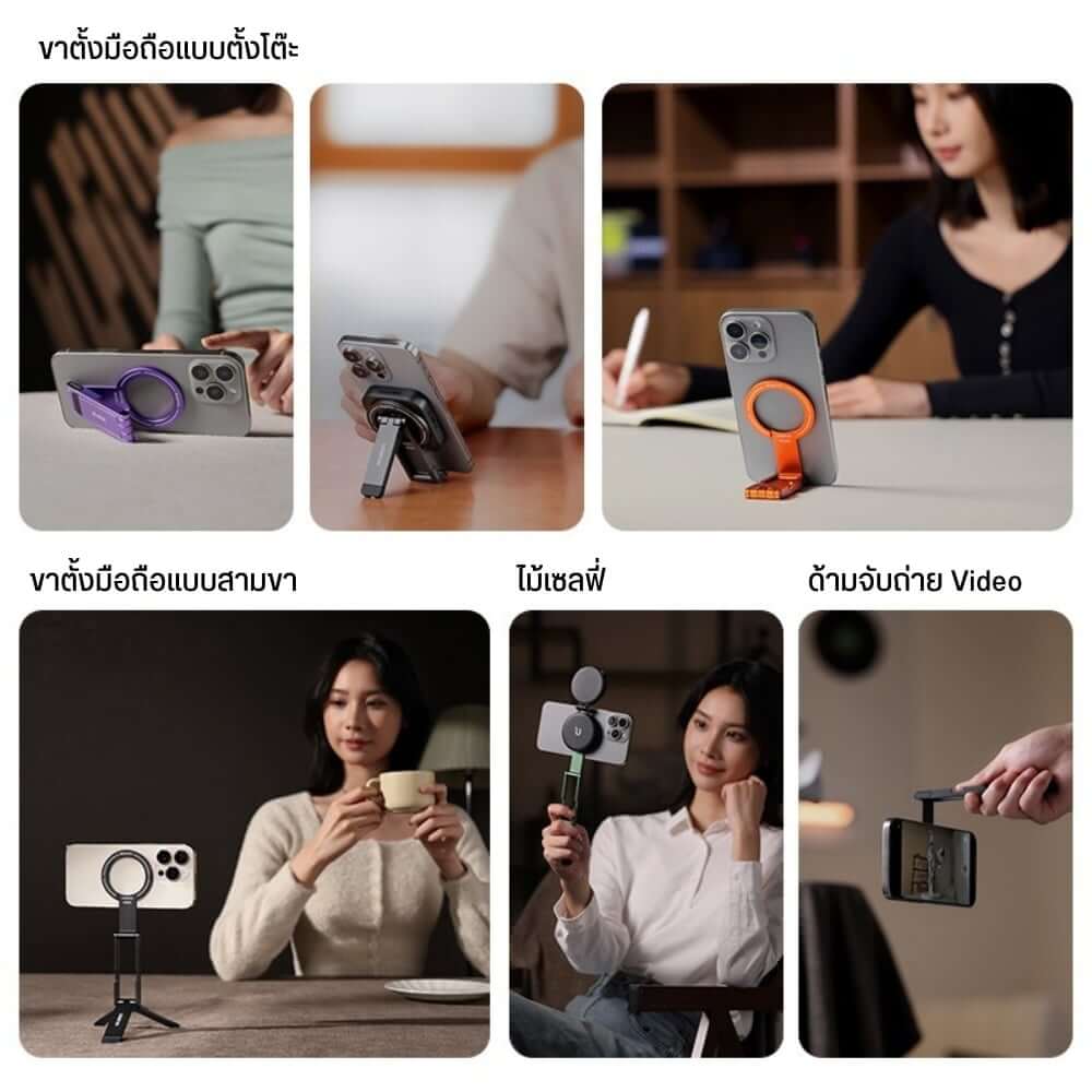 1.Desktop Stand: ตั้งโต๊ะดูหนัง, ประชุมออนไลน์ 2.Phone Tripod: ยืดขา 21.4-24.2cm ถ่ายวิดีโอ, Live 3.Handheld: พับถือมือเหมือน Selfie Stick ถ่ายเซลฟี่, Vlog 4.Top Handle: จับด้านบนถ่ายมุมต่ำ, มุมพิเศษ