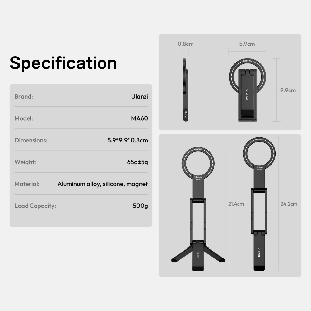 Specifications - Brand/Model: Ulanzi MA60 - Material: Aluminum alloy, Silicone, Magnet - Dimensions: 5.9×9.9×0.8cm - Weight: 65g±5g - Load Capacity: 500g - Magnetic Force: 14N (Front Magnetic Force) - Extended Length: 21.4-24.2cm - Adjustment Range: 360° rotation - Colors: Black - Compatibility: MagSafe compatible phones and universal phones with magnetic ring