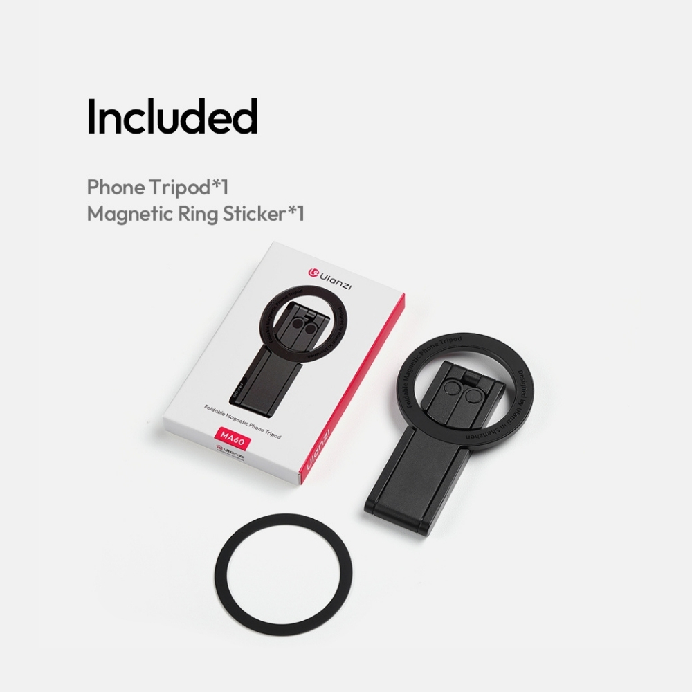 อุปกรณ์ที่มาในชุด - ขาตั้ง Ulanzi MA60 จำนวน 1 ชิ้น - Magnetic Ring Sticker จำนวน 1 ชิ้น - คู่มือการใช้งาน 1 เล่ม