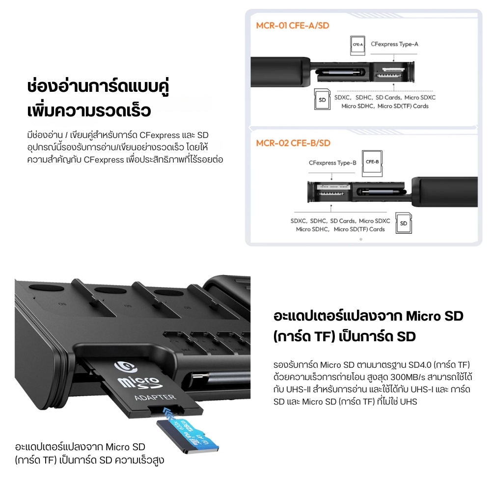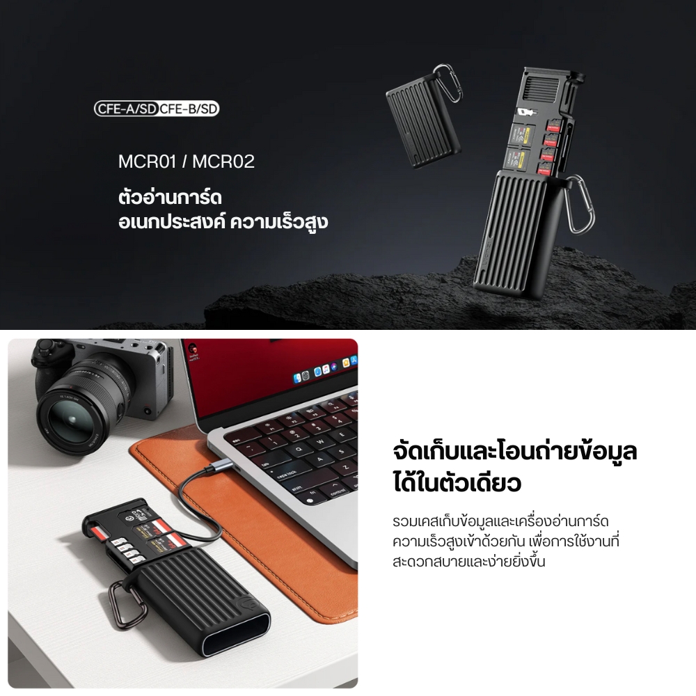 Ulanzi MCR-01/MCR-02 Multifunctional High-Speed Card Readerการ์ดรีดเดอร์พร้อมกล่องเก็บการ์ดหน่วยความจำระดับพรีเมียมUlanzi MCR-01/MCR-02 Multifunctional High-Speed Card Reader ไม่ใช่เพียงการ์ดรีดเดอร์ทั่วไป แต่เป็นโซลูชันการจัดการการ์ดหน่วยความจำระดับมืออาชีพที่ออกแบบมาเพื่อตอบโจทย์นักสร้างคอนเทนต์ยุคใหม่ ด้วยคุณสมบัติที่โดดเด่นทั้งการจัดเก็บและถ่ายโอนข้อมูลความเร็วสูง MCR-01/MCR-02 ช่วยให้คุณจัดการไฟล์มีเดียได้อย่างมีประสิทธิภาพและรวดเร็วกว่าที่เคย รองรับทั้งการ์ด CFexpress, SD และ Micro SD พร้อมความสามารถในการถ่ายโอนข้อมูลที่รวดเร็วสูงสุดถึง 1000MB/s สำหรับ CFexpress cards และ 312MB/s สำหรับ SD 4.0 UHS-II/Micro SD(TF) cards ช่วยให้การทำงานของคุณราบรื่นและรวดเร็วยิ่งขึ้น คุณสมบัติเด่น