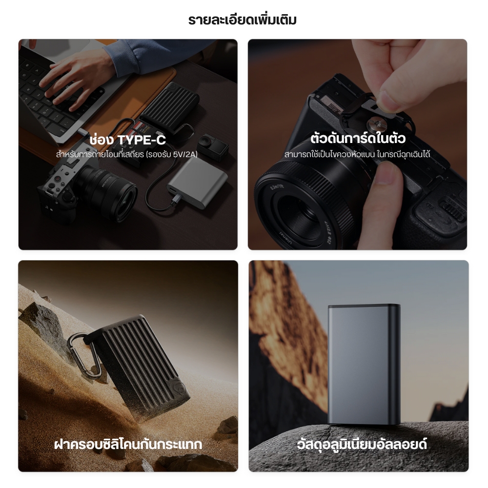 - พกพาสะดวก ปลอดภัย - น้ำหนักเบา 205 กรัม เคสซิลิโคนป้องกันกระแทก มีคาราบิเนอร์แขวนกระเป๋า เหมาะสำหรับครีเอเตอร์และช่างภาพ