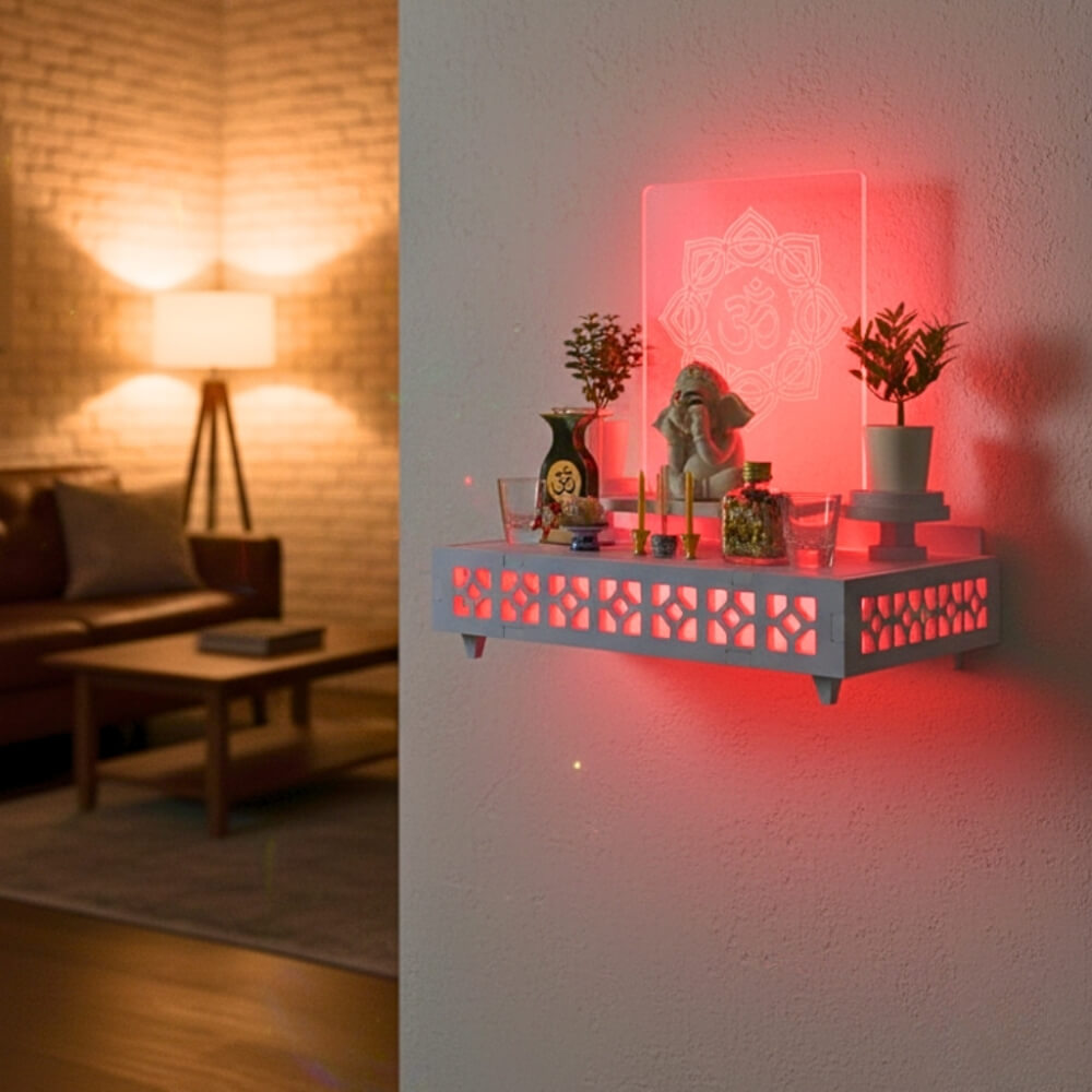 หิ้งพระมีไฟสไตล์โมเดิร์น KAF รุ่น SHBOX-LIGHT01 ลายโอมหิ้งพระพร้อมไฟ LED รุ่น SHBOX-LIGHT01 ลายโอม สไตล์มินิมอล-โมเดิร์น เหมาะสำหรับบูชาพระพุทธ พระพิฆเนศ หรือองค์เทพต่าง ๆ วางบนโต๊ะหรือติดผนังได้ทันที โดยไม่ต้องซื้อขาฉากเพิ่ม รองรับพระประธานฐานกว้าง 7 นิ้ว ไฟ LED มาพร้อมรีโมท 24 ปุ่ม สามารถเปลี่ยนสี หรี่ไฟ หรือปรับโหมดกะพริบได้ง่าย ใช้พลังงานผ่านพอร์ต USB (ไม่มีหัวปลั๊กแถม) สามารถเชื่อมต่อกับคอมพิวเตอร์ แบตสำรอง หรืออะแดปเตอร์มาตรฐานได้ ลวดลาย “โอม” สลักด้วยเลเซอร์บนอะคริลิคใสหนา 3 มม. ให้ความคมชัดและศักดิ์สิทธิ์ ชั้นวางผลิตจากพลาสวูดคุณภาพสูง หนา 10 มม. ทนทาน กันน้ำ ไม่ติดไฟ ไม่เป็นที่อยู่อาศัยของปลวกหรือแมลง และทำความสะอาดง่าย
