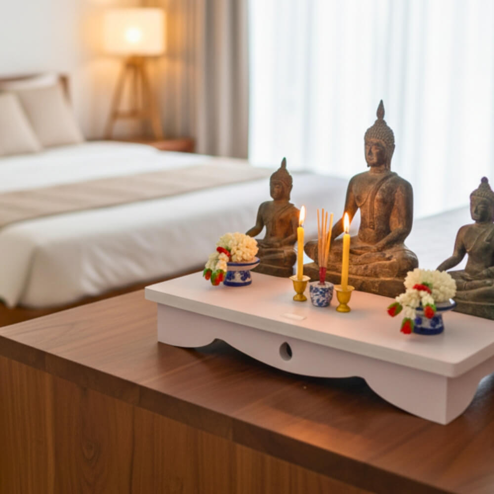 วางบนโต๊ะหรือชั้นวางที่มั่นคง จัดวางองค์พระให้สมดุลและเรียบร้อย