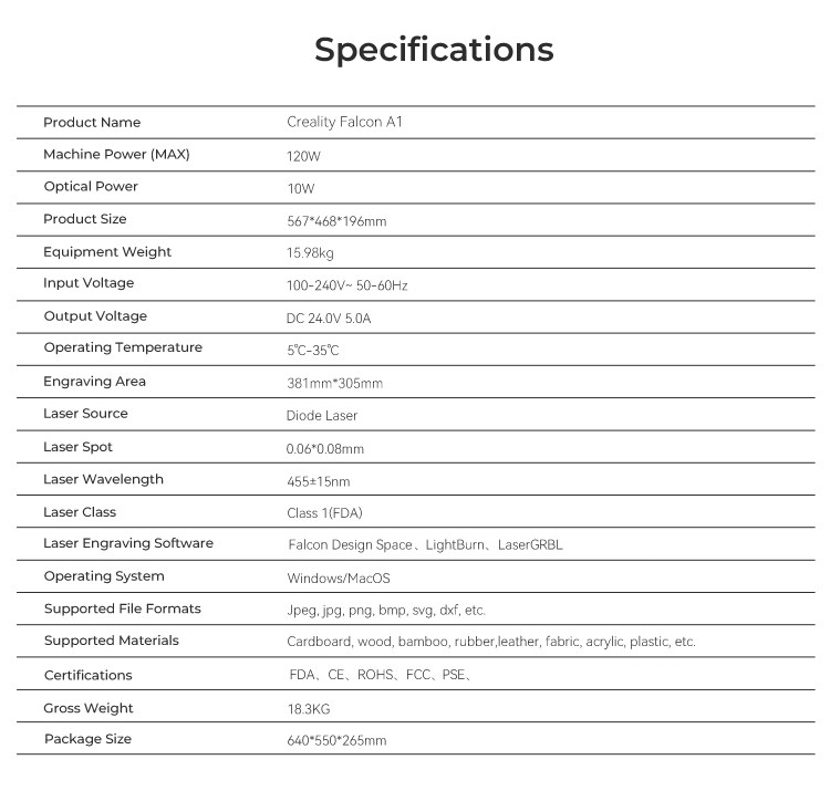 เครื่องปริ้นเลเซอร์และแกะสลัก CREALITY FALCON A1* หมายเหตุ 1. ทางบริษัทฯ ขอสงวนสิทธิ์ ในการรับผิดชอบใดๆ อันเนื่องจากข้อผิดพลาดทางการพิมพ์ (ผิด/ตก) 2. ทางบริษัทฯ ขอสงวนสิทธิ์ ในการเปลี่ยนแปลงราคาและโปรโมชั่นโดยไม่แจ้งให้ทราบล่วงหน้า
