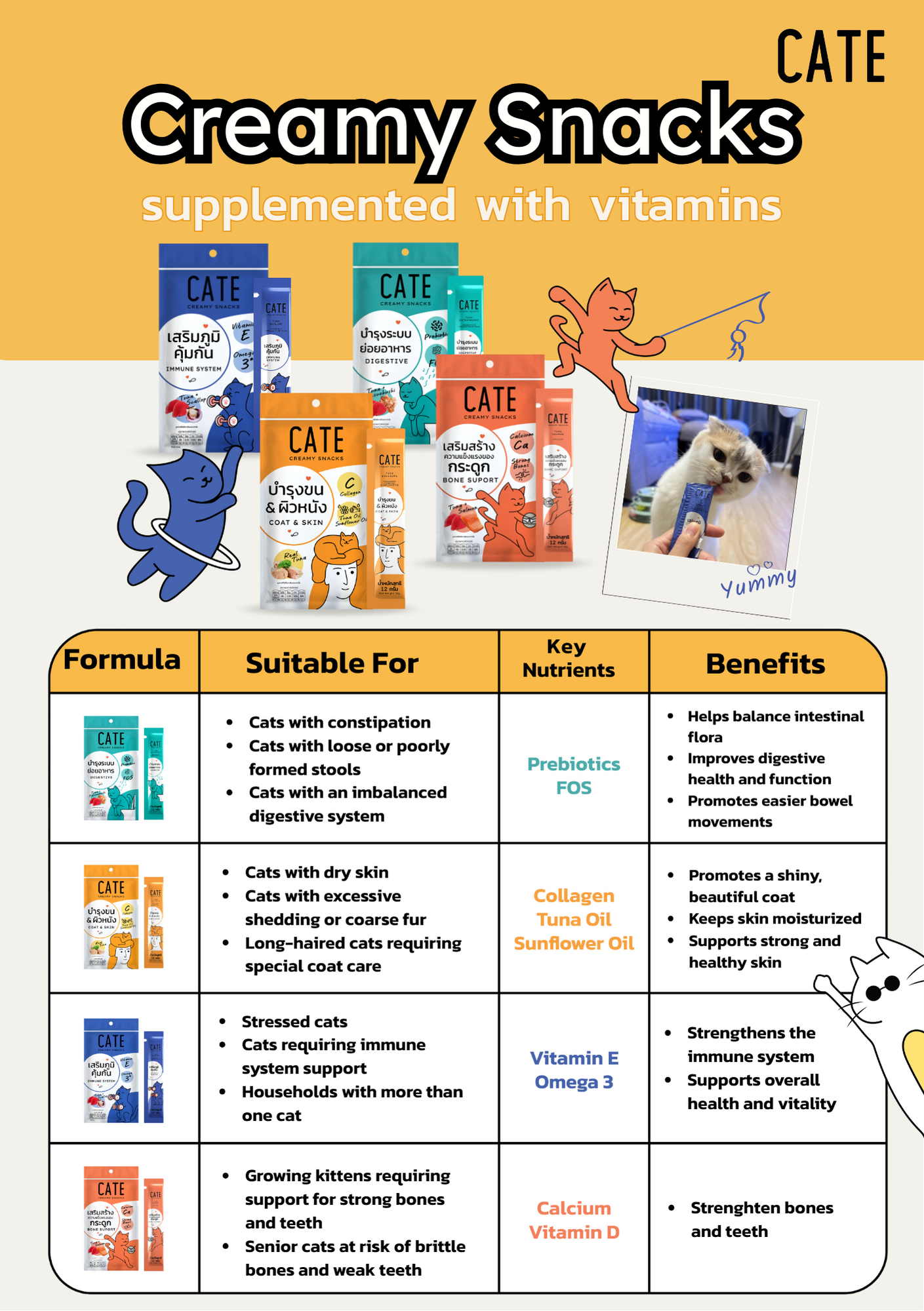 จุดเด่นของวิตามินแมวเลียเคท 😻เป็นแหล่งโปรตีนชั้นดี มี Omega 3 😻คุณภาพมาตราฐานส่งออก ❌ ไม่ใช้ผลพลอยได้จากสัตว์ ❌ ไม่ใส่สีผสมอาหาร ❌ ไม่ทำร้ายไต 🔬เคท ขนมแมว ที่มีทีมวิจัยแมวมาช่วยพัฒนาสูตร