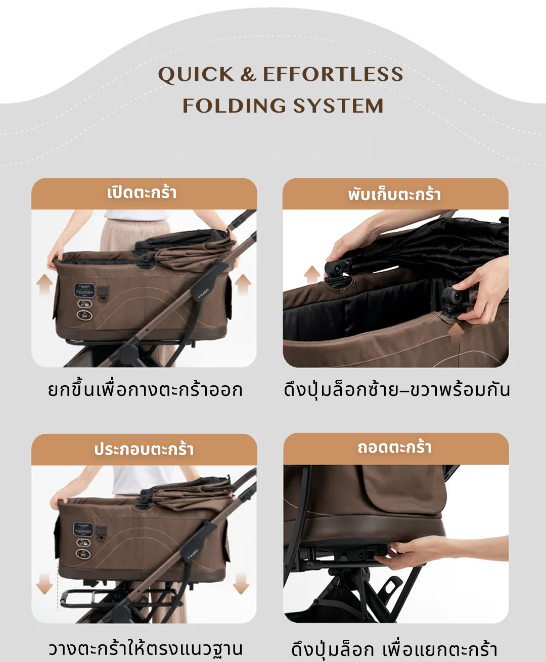 กาง–พับรถเข็นให้โครงและล้อถูกล็อกสนิท และคล้องสายเซฟตี้ให้น้องทุกครั้งก่อนเข็น ปรับหลังคาและช่องลมให้เหมาะกับสภาพอากาศ และพับเก็บในที่แห้งหลังใช้งานเพื่อยืดอายุการใช้งานของรถเข็น