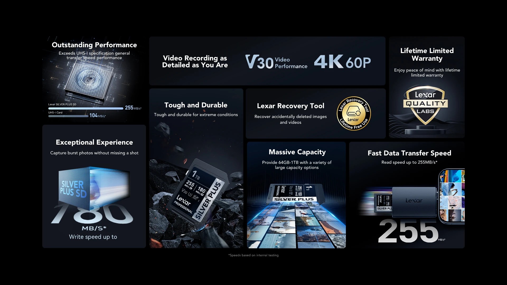 การ์ดหน่วยความจำ เอสดีการ์ด LEXAR SILVER PLUS 64GB UHS-I U3 V30 SD CARD SPEED BUMP FULL-HD 3D 4K RW255/135MB/S (LSDSIPL064G-BNNNG)Specifications Capacity 64GB, 128GB, 256GB, 512GB, 1TB Interface UHS-I Speed 64GB up to 255MB/s read, up to 135MB/s write1 128GB up to 255MB/s read, up to 180MB/s write1 256GB up to 255MB/s read, up to 180MB/s write1 512GB up to 255MB/s read, up to 180MB/s write1 1TB up to 255MB/s read, up to 180MB/s write1 Operating Temperature -25℃ to 85℃ (-13℉ to 185℉) Storage Temperature -40°C to 85°C (-40°F to 185°F) Limited lifetime warranty