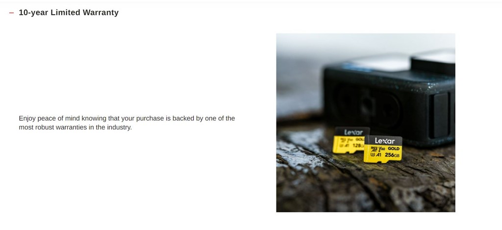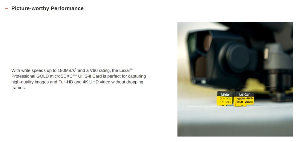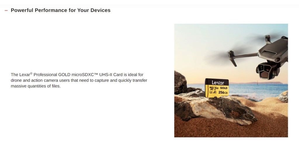 - การ์ด Lexar® Professional GOLD microSDXC™ UHS-II เป็นการ์ดประสิทธิภาพสูงที่สมบูรณ์แบบสำหรับการถ่ายภาพโดรนและกล้องแอคชั่น และยังเหมาะสำหรับอุปกรณ์เล่นเกมพกพา UHS-II อีกด้วย