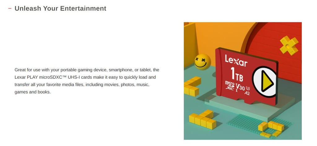 ✅เหมาะสำหรับใช้งานกับอุปกรณ์เล่นเกมแบบพกพา สมาร์ทโฟน และแท็บเล็ต ✅ความเร็วในการถ่ายโอนสูงถึง 150MB/s1 พร้อมประสิทธิภาพระดับ A1 หรือ A2 ✅ถ่ายภาพ เล่นและถ่ายโอนวิดีโอ 1080p Full-HD คุณภาพสูงจำนวนมากได้อย่างรวดเร็ว