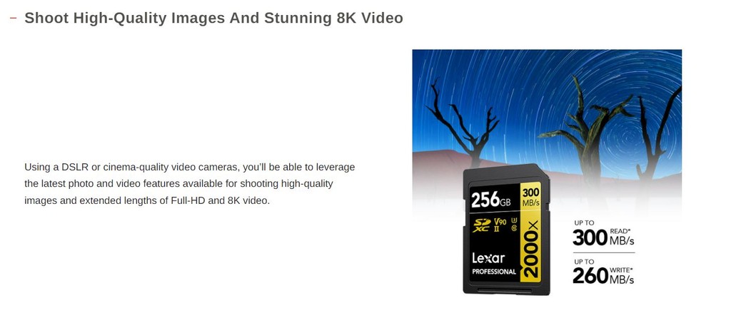 ✅ เหมาะกับการถ่ายภาพคุณภาพสูงและขยายความยาววิดีโอ Full-HD และ 8K ✅ จัดการกับโหมดถ่ายภาพต่อเนื่องเป็นชุดและ RAW plus JPEG ได้อย่างง่ายดาย ✅ ออกแบบมาให้ป้องกันการกระแทก การสั่นสะเทือน และป้องกันรังสีเอ็กซ์ ✅ สามารถใช้กับอุปกรณ์ที่รองรับ UHS-I โดยจะได้ความเร็วสูงสุดตามที่อุปกรณ์รองรับ