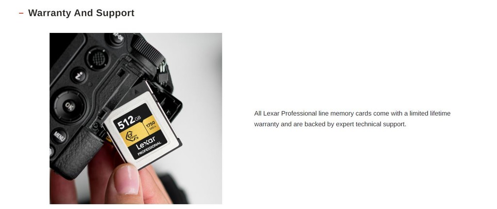 Specification Form Factor CFexpress™ Type B Interface PCIe Gen3x2 Speed up to 1750MB/s read, up to 1000MB/s write1 Operating Temperature -10° C to 70° C (14°F to 158°F) Storage Temperature -25 °C to 85 °C (-13 °F to 185 °F) Dimension (L x W x H) 29.60 x 38.50 x 3.80 mm / 1.16” x 1.51” x 0.14” Weight 7.65 g / 0.016 lbs Warranty Limited lifetime warranty