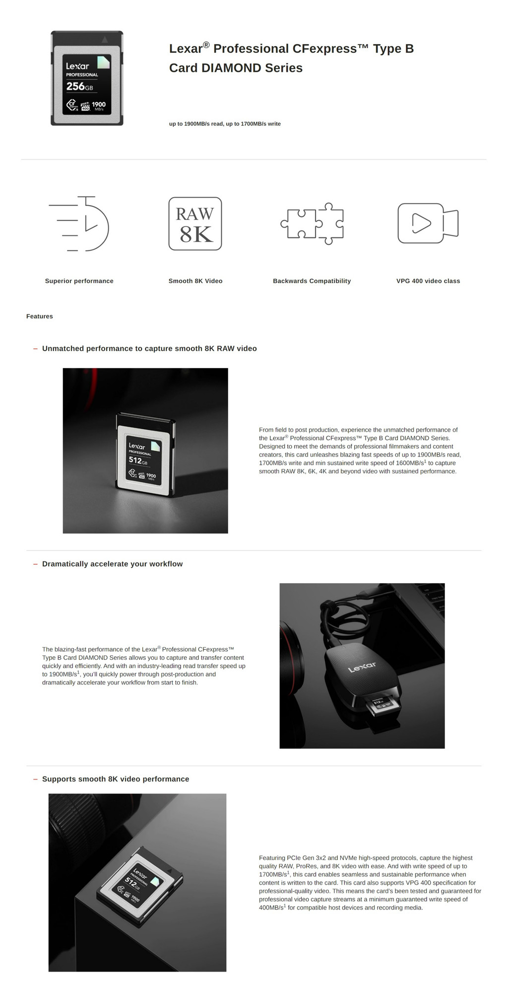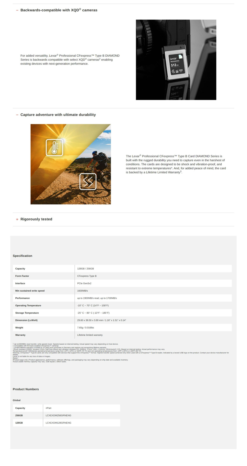 Specification ● Capacity : 128GB / 256GB ● Form Factor : CFexpress Type B ● Interface : PCIe Gen3x2 ● Speed : up to 1900MB/s read, up to 1700MB/s ● Min sustained write speed : 1600MB/s ● Operating Temperature : 0 °C to 70 °C (32 °F to 158 °F) ● Storage Temperature : -25 °C to 85 °C (-13 °F to 185 °F)