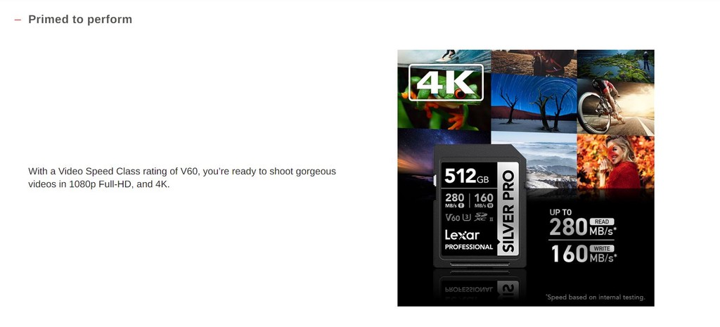 - Speed class V60 รองรับความละเอียดระดับ 1080p Full-HD และ 4K