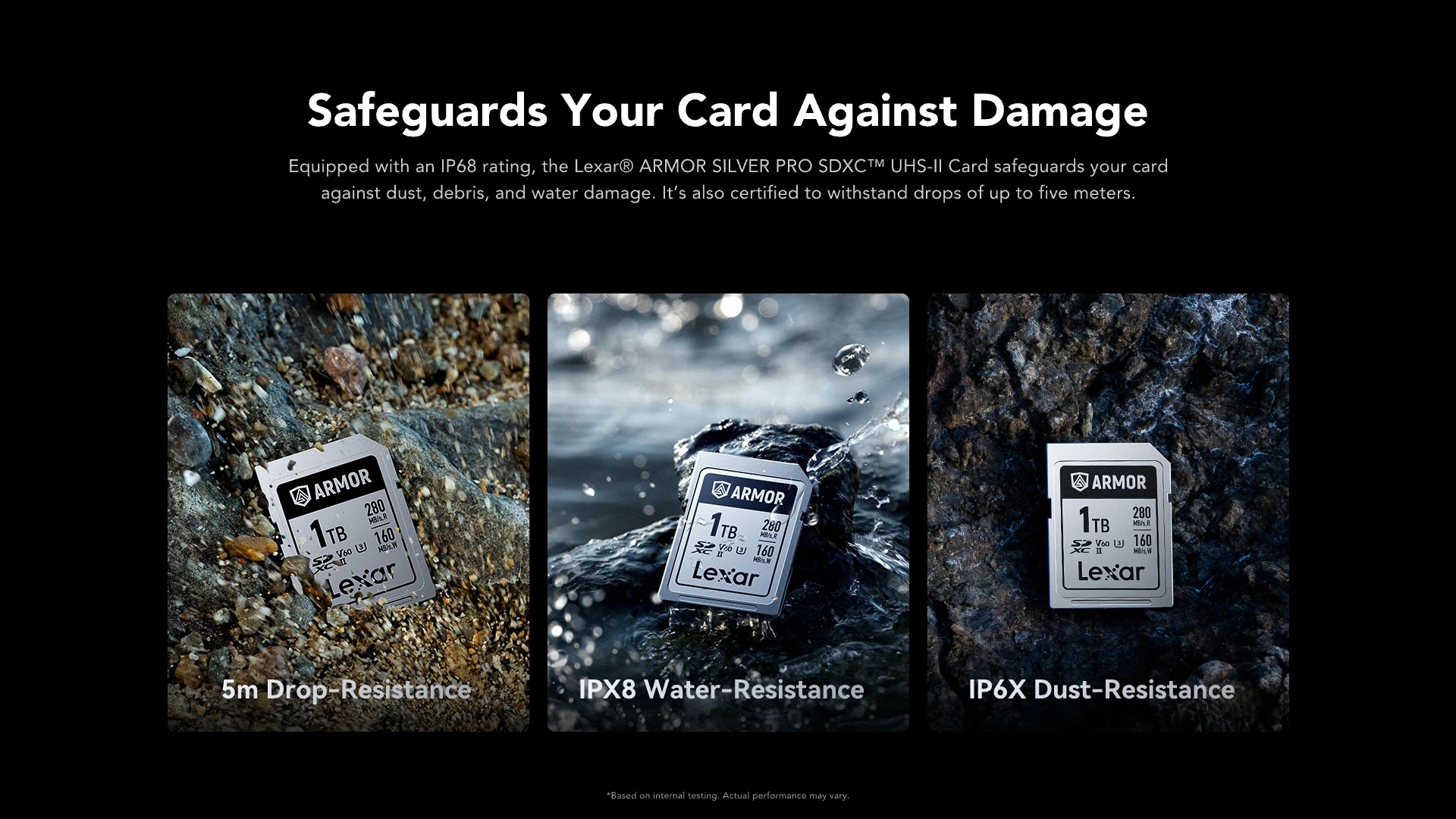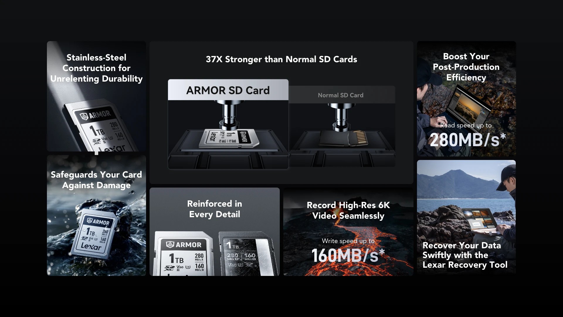 ✅ โครงสร้างสแตนเลสแข็งแรงกว่าการ์ด SD ทั่วไปถึง 37 เท่า ✅ ได้รับการจัดอันดับ IP68 ทนฝุ่นและน้ำ ทนการตกกระแทกได้สูงถึง 5 เมตร ✅ การออกแบบที่เรียบง่ายทำให้การ์ดแข็งแรงขึ้น ไม่มีโครงและไม่มีสวิตช์ป้องกันการเขียน ✅ ความเร็วในการเขียนสูงสุด 160MB/วินาที พร้อม Video Speed Class 60 (V60) เพื่อบันทึกภาพ 6K ได้อย่างราบรื่น ✅ จับคู่กับเครื่องอ่านการ์ด USB 3.2 เพื่อถ่ายโอนภาพถ่ายและวิดีโอได้อย่างรวดเร็วด้วยความเร็วสูงสุด 280MB/วินาที ✅ เข้าถึง Lexar Recovery ได้ตลอดชีพ