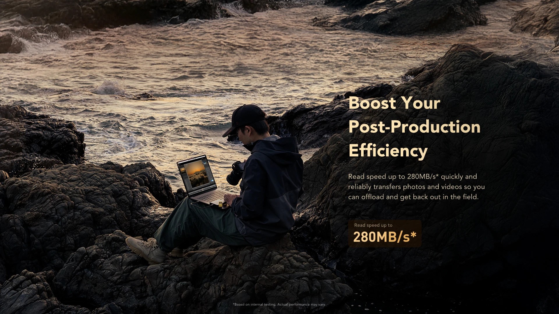 - จับคู่กับเครื่องอ่านการ์ด USB 3.2 เพื่อถ่ายโอนภาพถ่ายและวิดีโอได้อย่างรวดเร็วด้วยความเร็วสูงสุด 280MB/วินาที