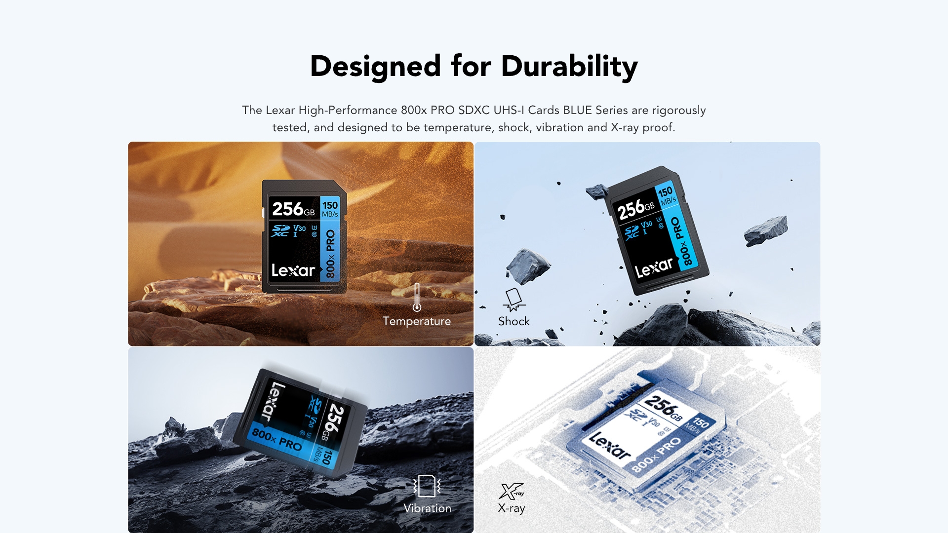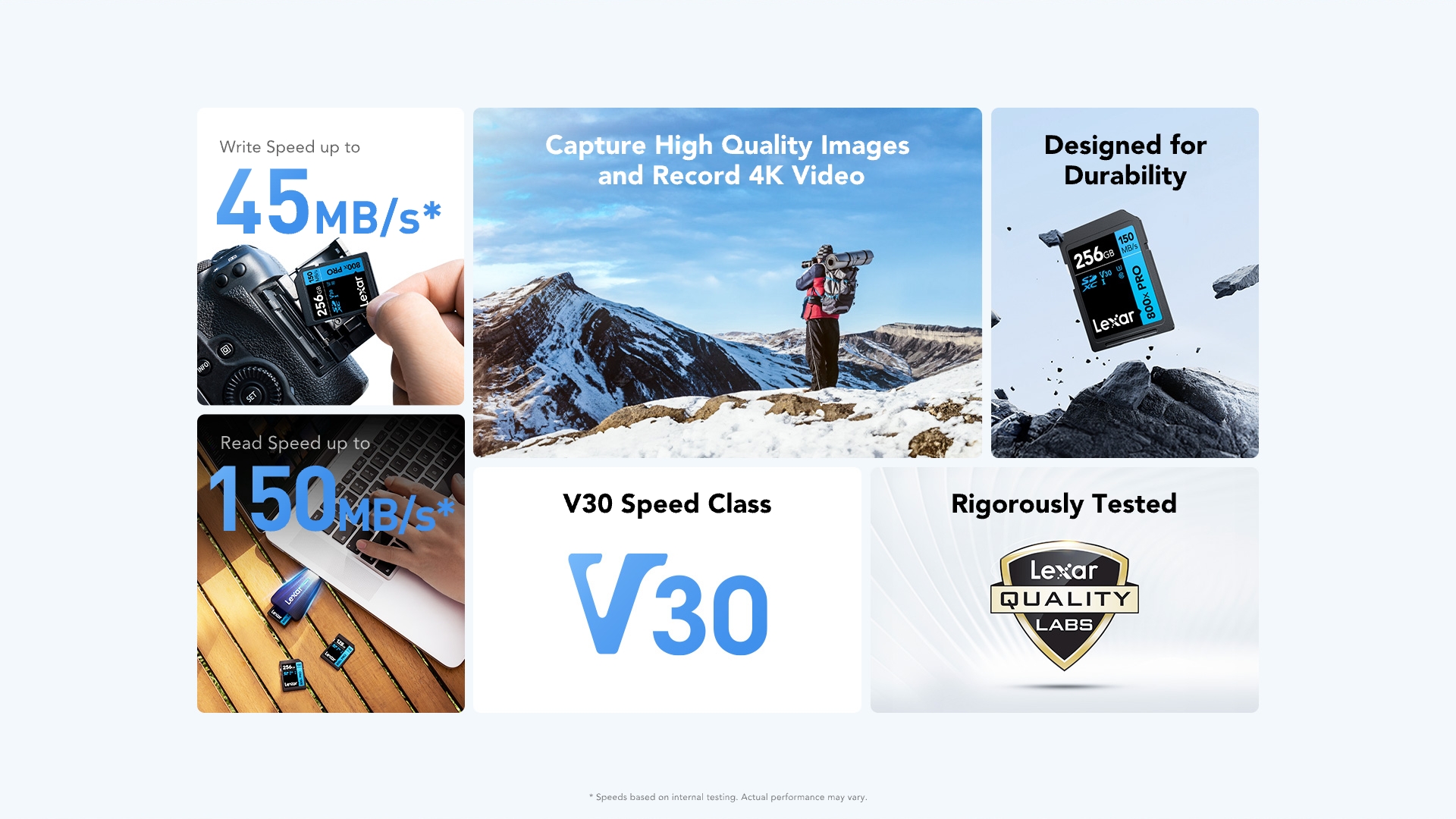 - ออกแบบด้วยเทคโนโลยี UHS-I สำหรับกล้อง DSLR แบบเล็งแล้วถ่ายและระดับกลาง รวมถึงกล้องวิดีโอ HD